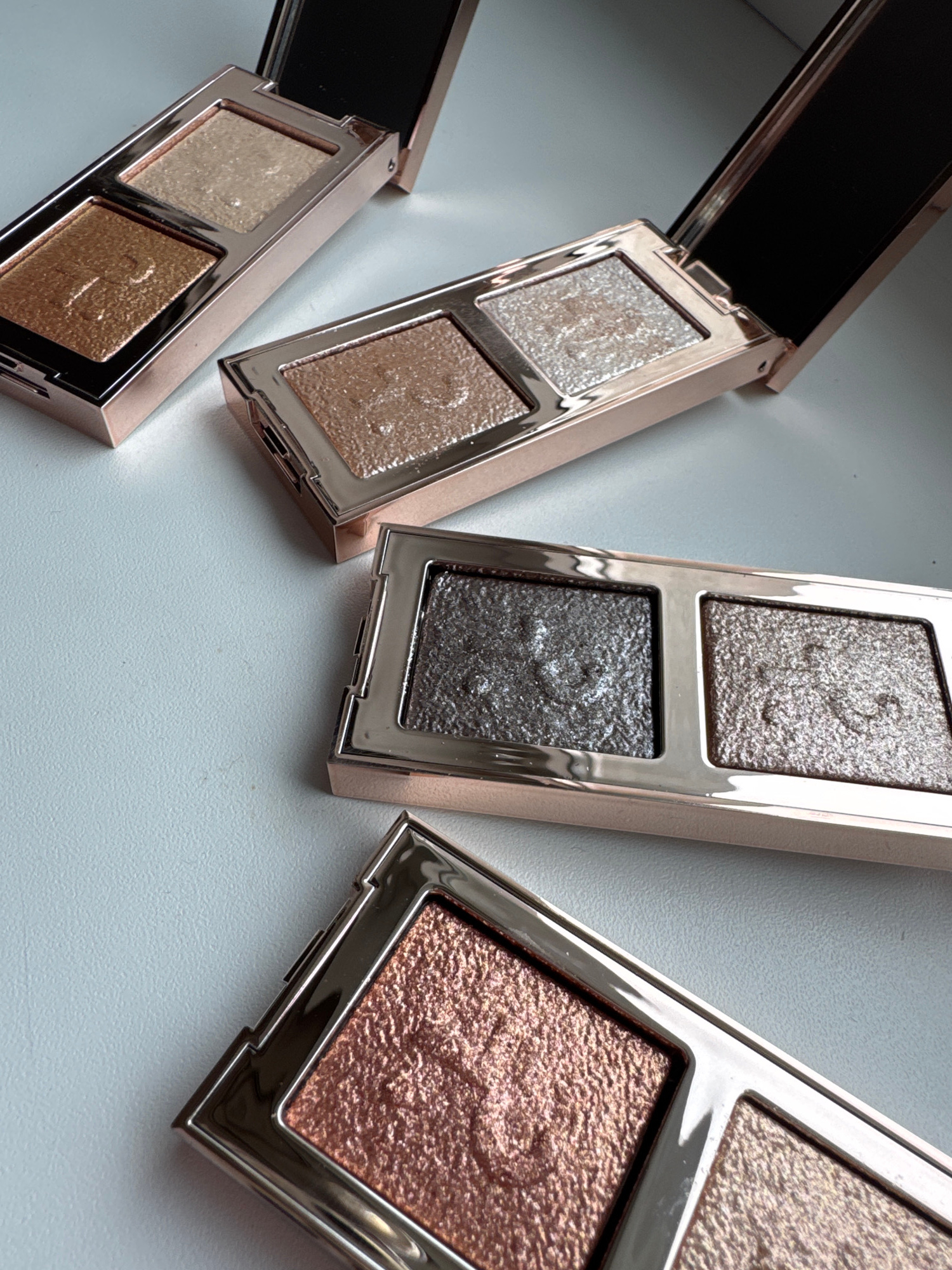 The image shows three open, two-pan eyeshadow palettes and one closed eyeshadow palette, arranged on a light-colored surface. The open palettes display various shades of glittery eyeshadows. The palet…read more
