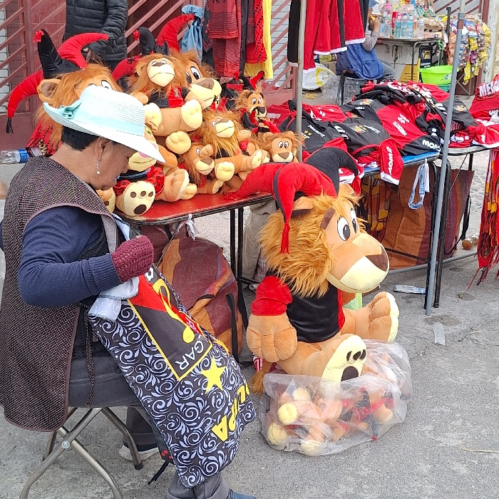 A vendor sits among their wares on a sidewalk. Red and black shirts hang on a metal rack, and a cart overflows with plush lion toys wearing red hats. Larger lion plushies with red armbands and black sā¦read more