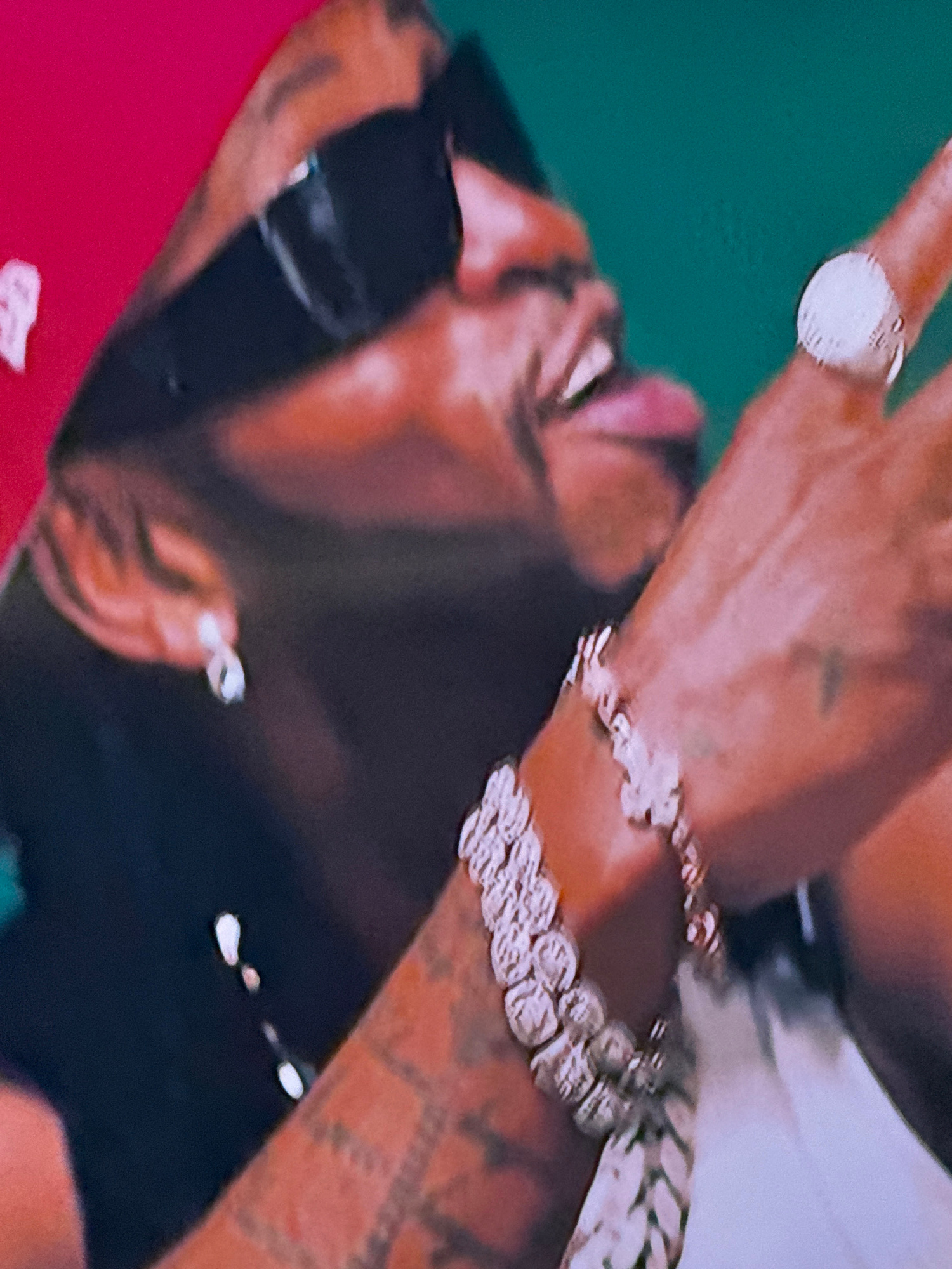 A close-up shot features a person wearing dark sunglasses, with their face slightly blurred and their tongue partially visible. The individual has several pieces of jewelry including a large ring on t…read more