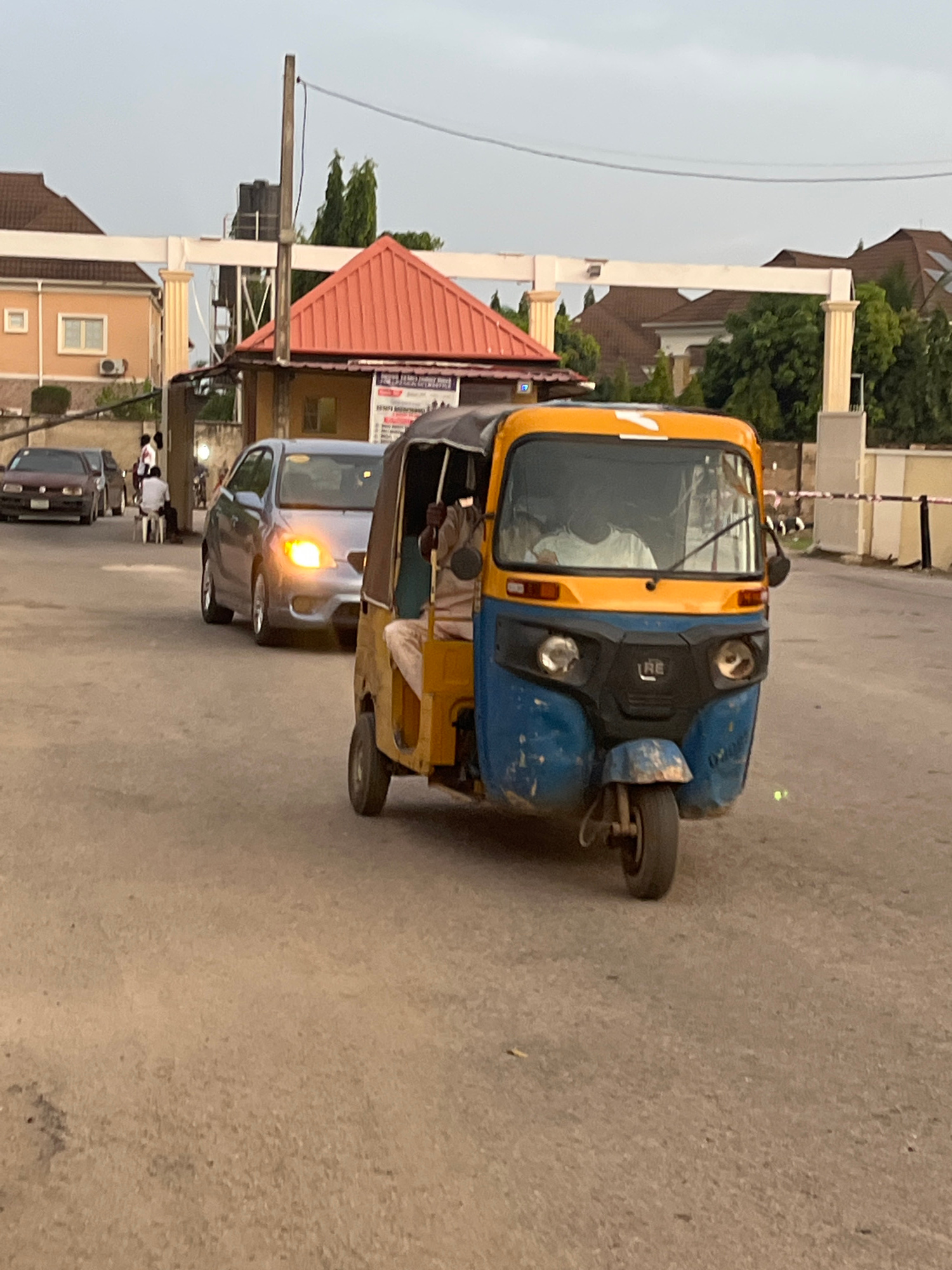 The image shows a blue and yellow motorized tricycle, commonly known as a "Keke Napep," parked on a paved street. A silver car is partially visible behind it. In the background, there are buildings, i…read more