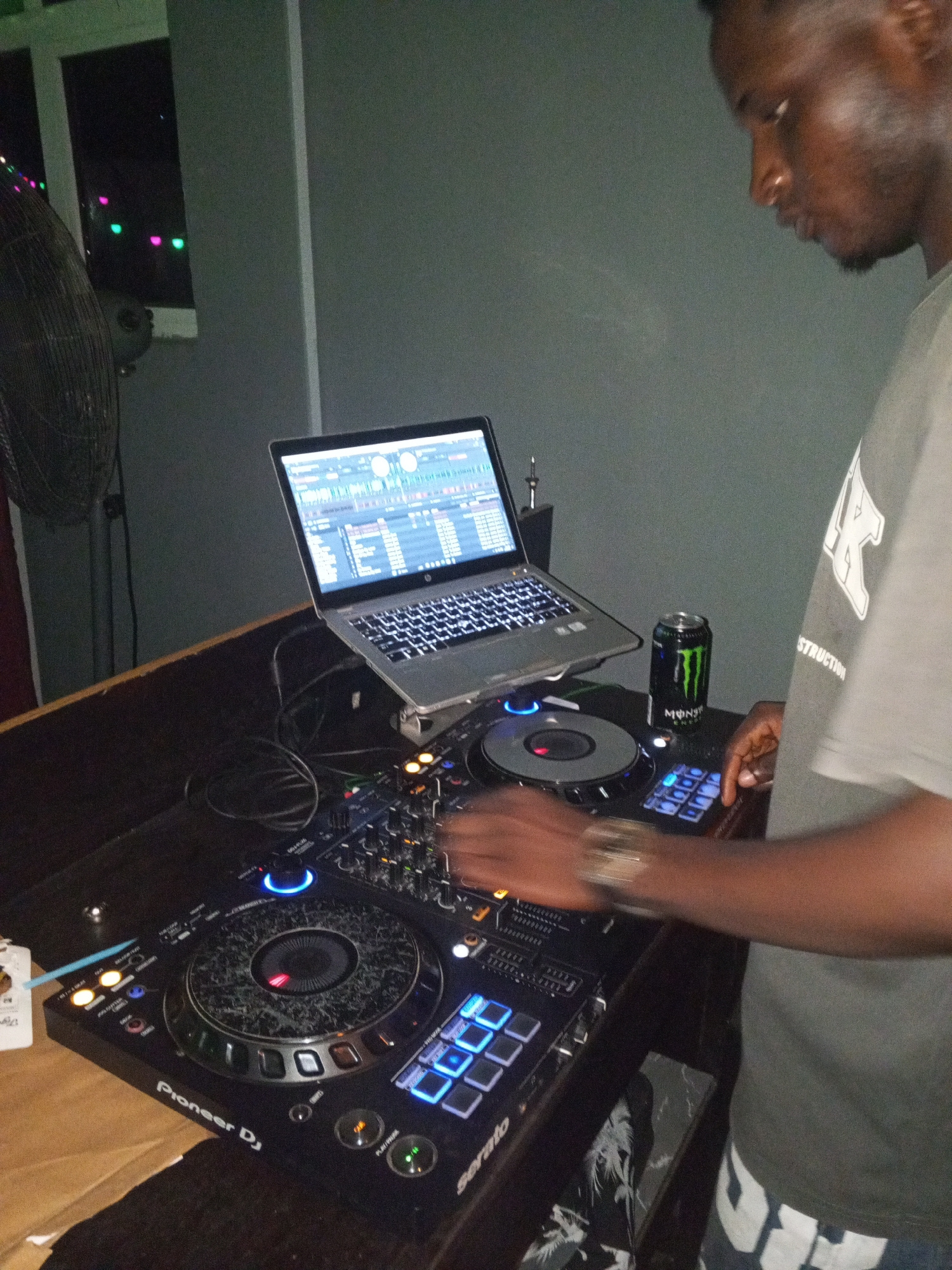 The image shows a DJ, likely male, operating a Pioneer DJ Serato mixing console connected to a laptop displaying DJ software. A can of Monster energy drink sits next to the console. The scene is indoo…read more