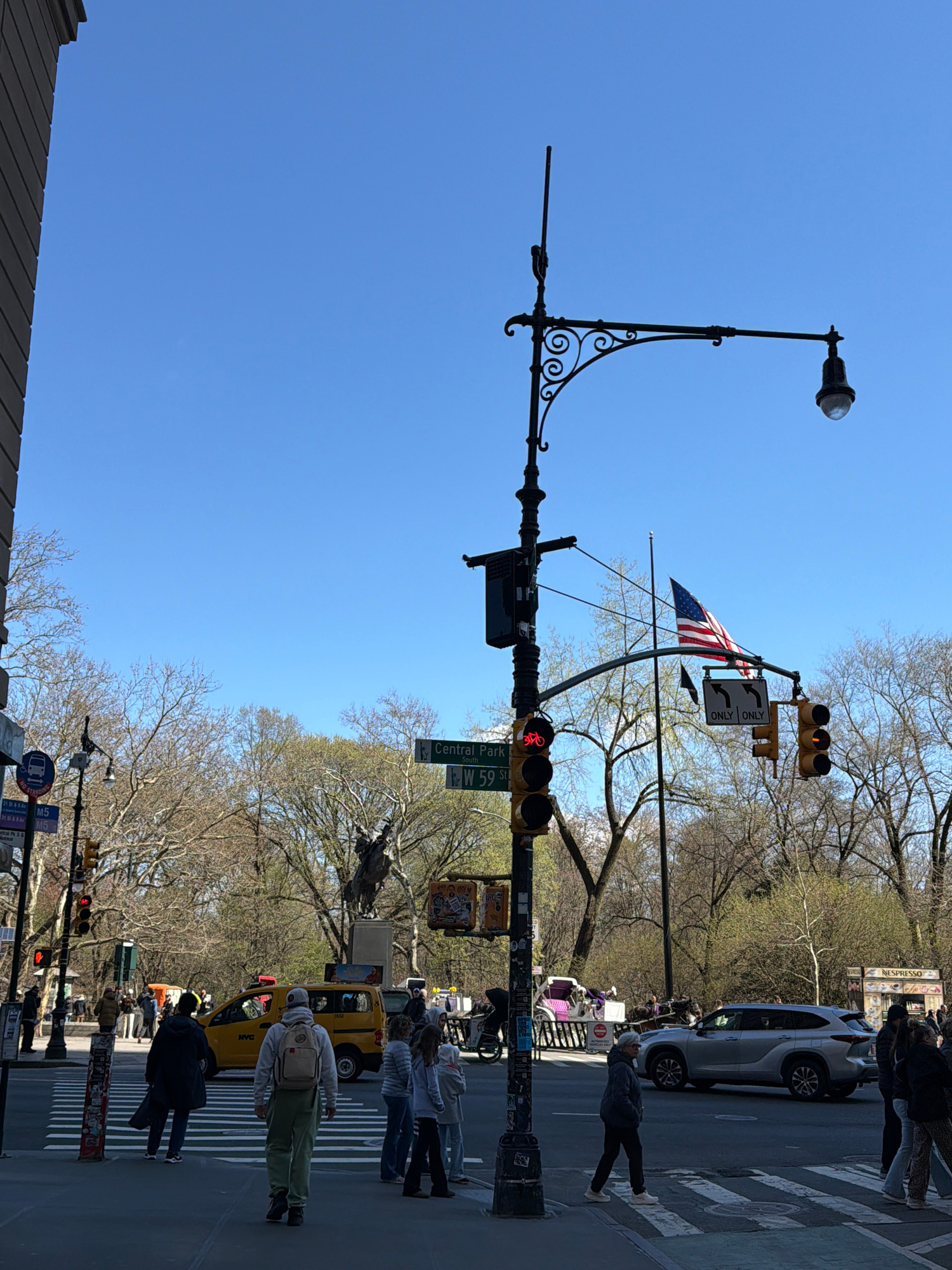 The image depicts a street scene in New York City, United States of America, specifically at the intersection of Central Park South (W 59th Street). The view is from street level looking upward. In t…read more