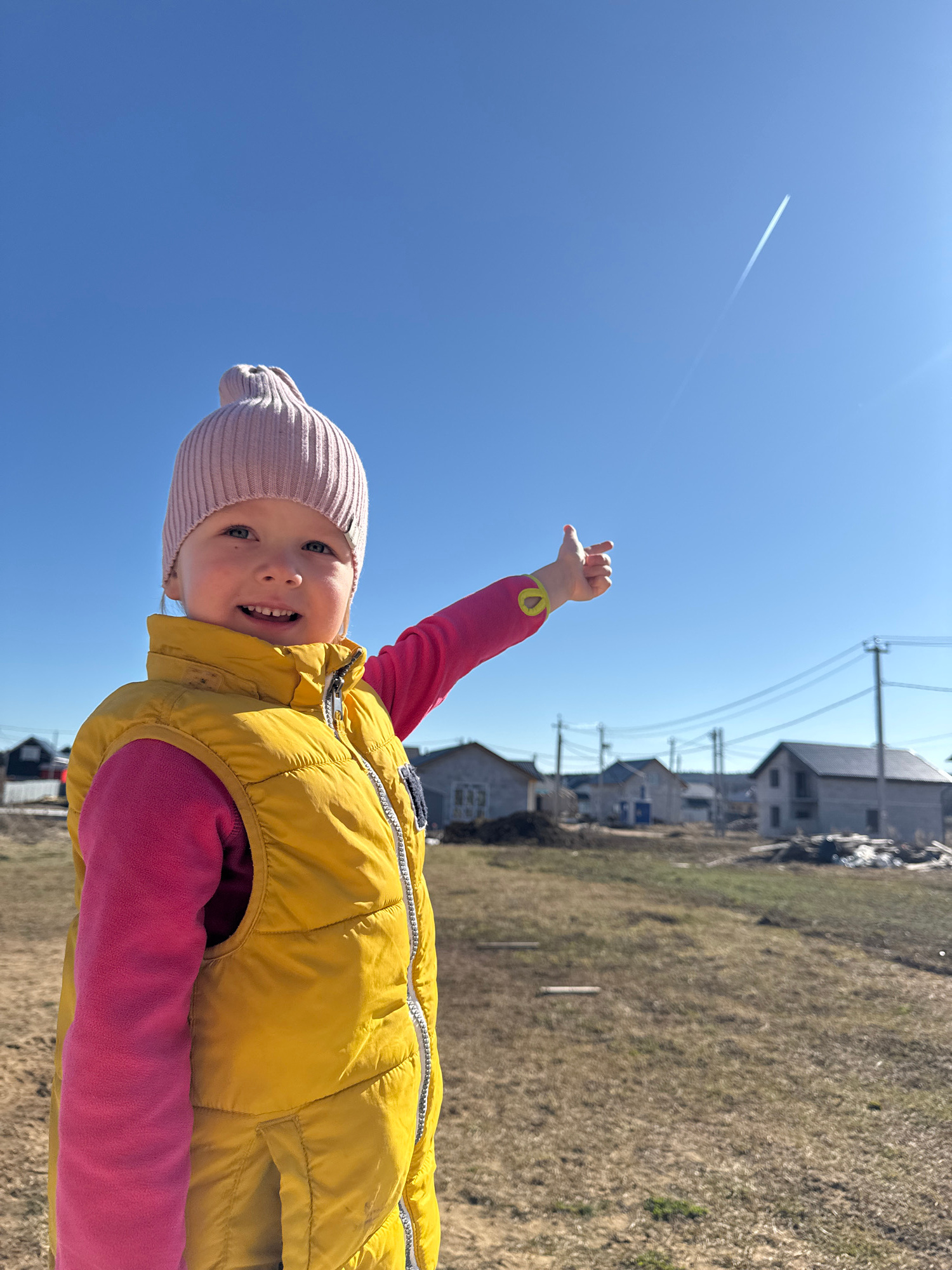 The image shows a young child outdoors in Gornyi, Russia. The child, wearing a pink hat, a pink long-sleeved shirt, and a yellow vest, is looking at the camera and pointing up at the sky. A white cont…read more