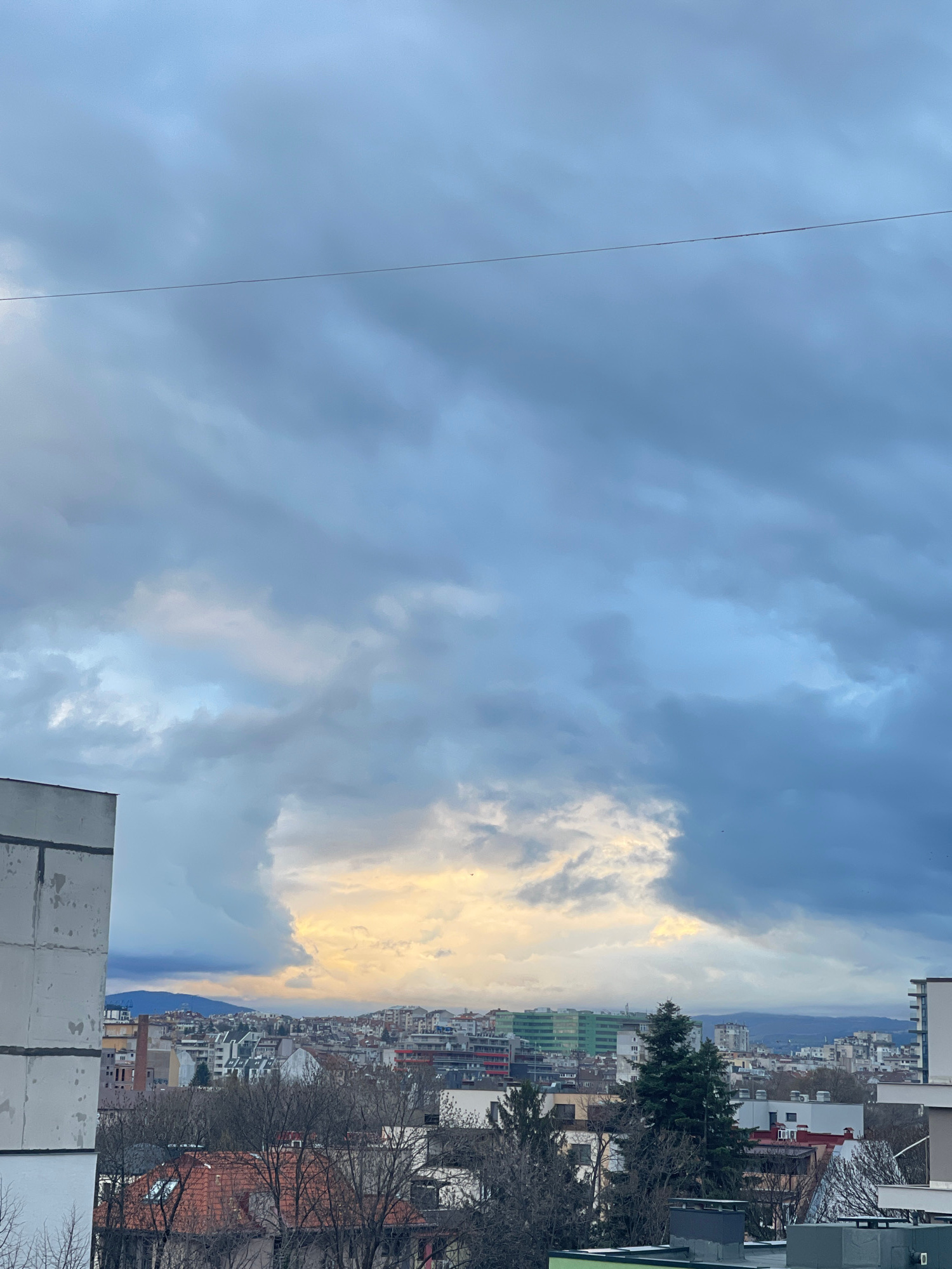 The image shows a cityscape with cloudy skies. In the distance, mountains are visible on the horizon, suggesting the outskirts of the city. The scene includes buildings of varying heights and architec…read more
