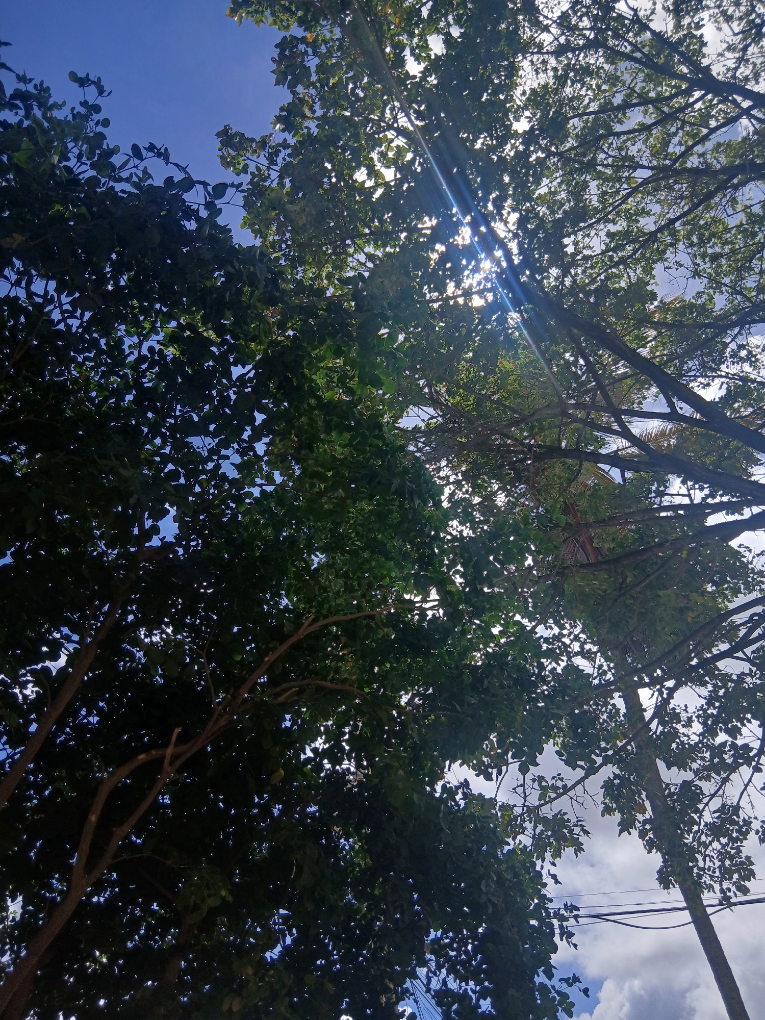 The image depicts a low-angle view looking up through the dense canopy of trees, possibly in Juan Griego, Venezuela. Sunlight is filtering through the leaves, creating bright flares and dappled shadow…read more
