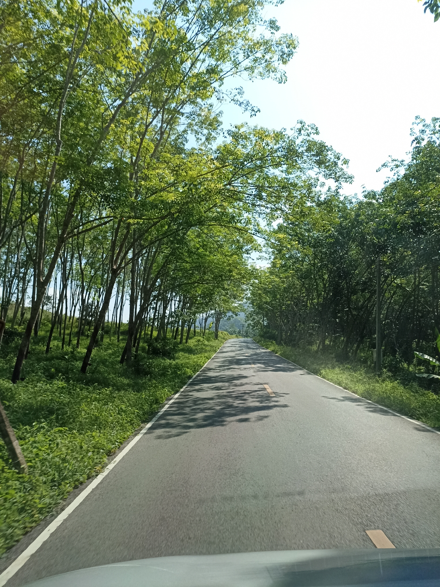 The image depicts a two-lane asphalt road cutting through a wooded area near Ban Pak Ra, Thailand. Trees with green foliage line both sides of the road, casting shadows on the pavement. A yellow cente…read more