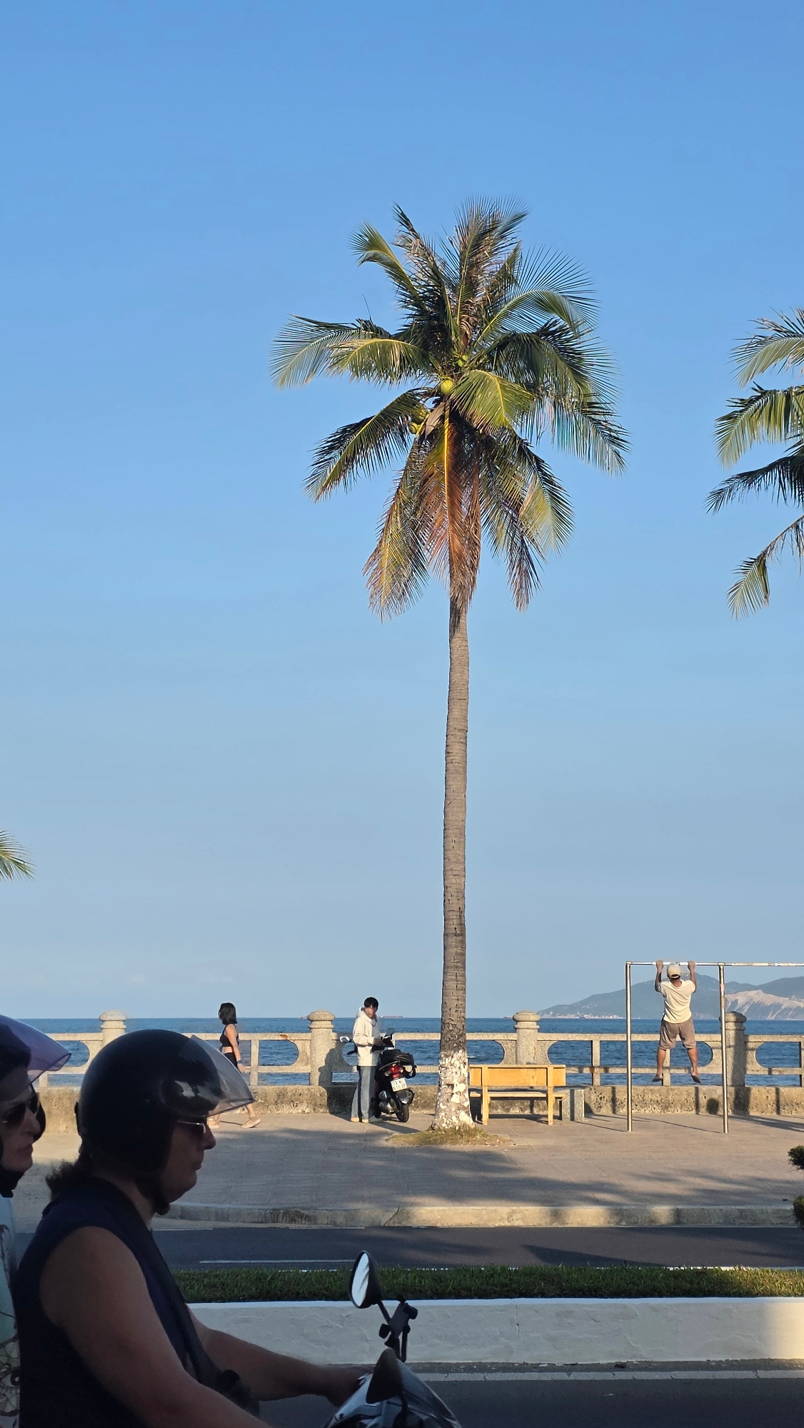 This image captures a bright, sunny coastal scene in Bắc Nha Trang, Vietnam. The sky is a vivid, cloudless blue, indicating clear weather. A very tall, slender palm tree with a crown of green fronds,…read more