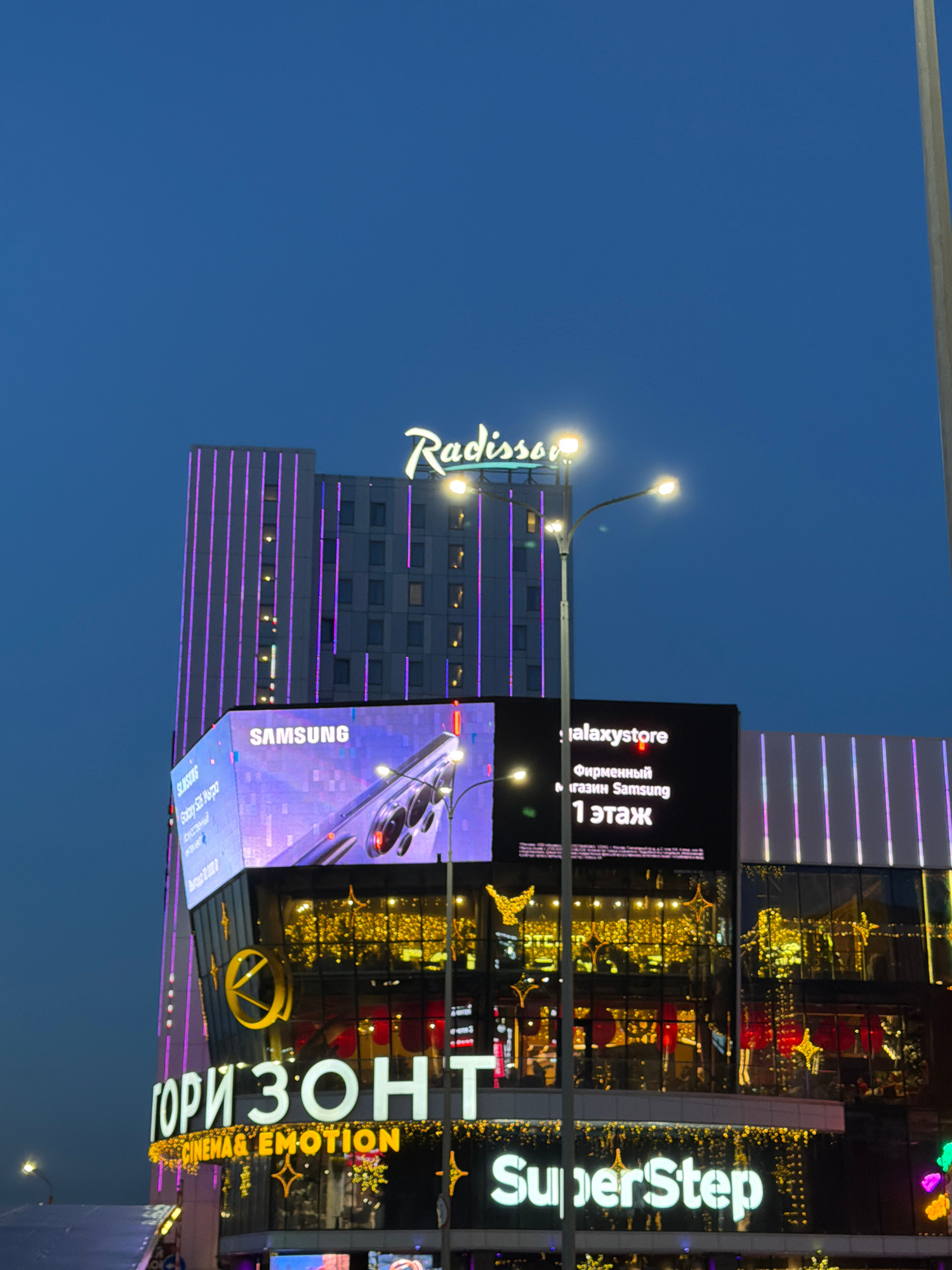 Here's a description of the image: The image is a nighttime shot of buildings in Rostov-on-Don, Russia, featuring prominent advertisements. A building with the "Radisson" name in illuminated letters…read more