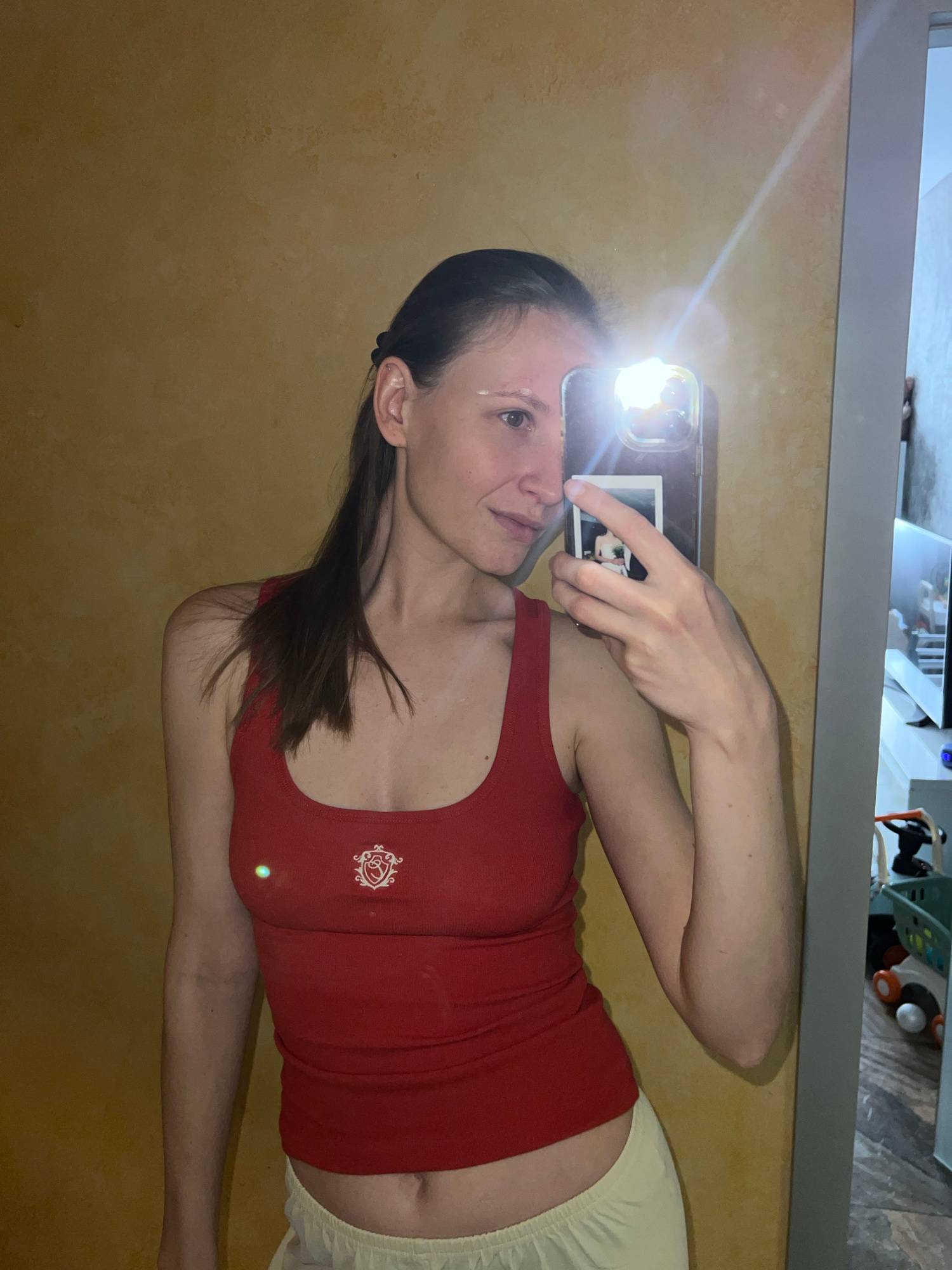 A woman with brown hair is taking a selfie in front of a mirror. She is wearing a red tank top and light yellow shorts. The mirror reflects part of a room, including what appears to be a shelf with to…read more