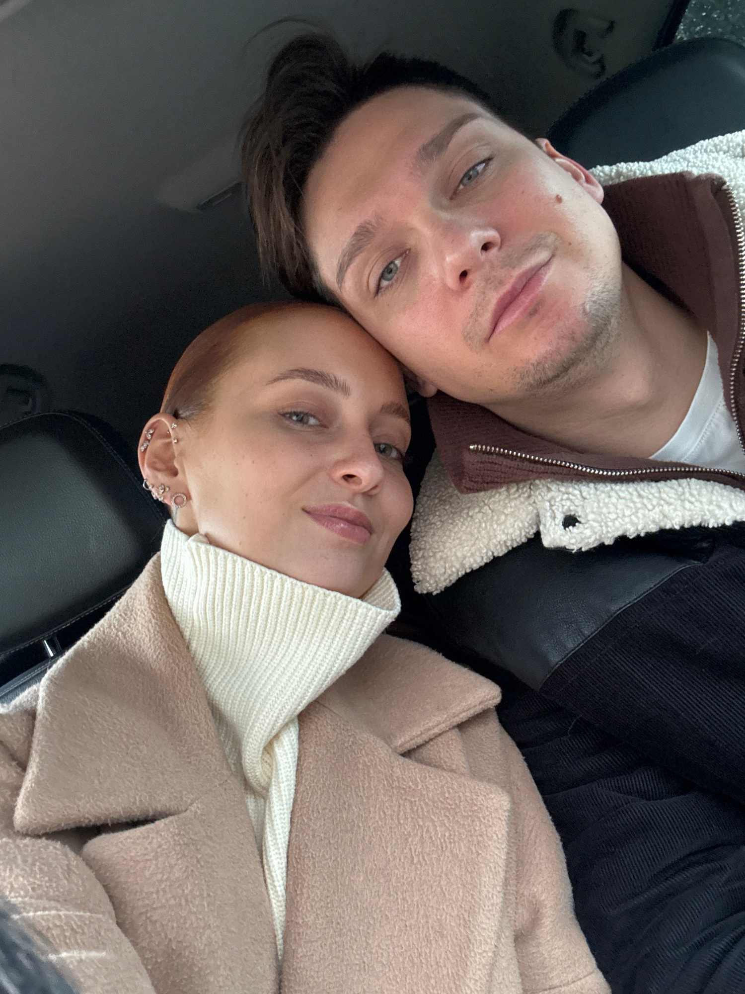 The image is a close-up, overhead shot of two people lying down. The person on the left is male, with short brown hair, light eyes, and fair skin. He is wearing a white t-shirt under a brown jacket wi…read more