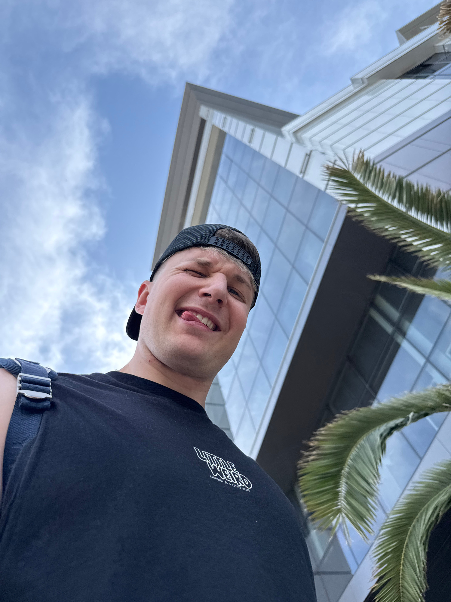 A dynamic, low-angle photograph captures a young man from the chest up, looking downwards and smiling playfully at the camera. He wears a black baseball cap and a black t-shirt, featuring a white styl…read more