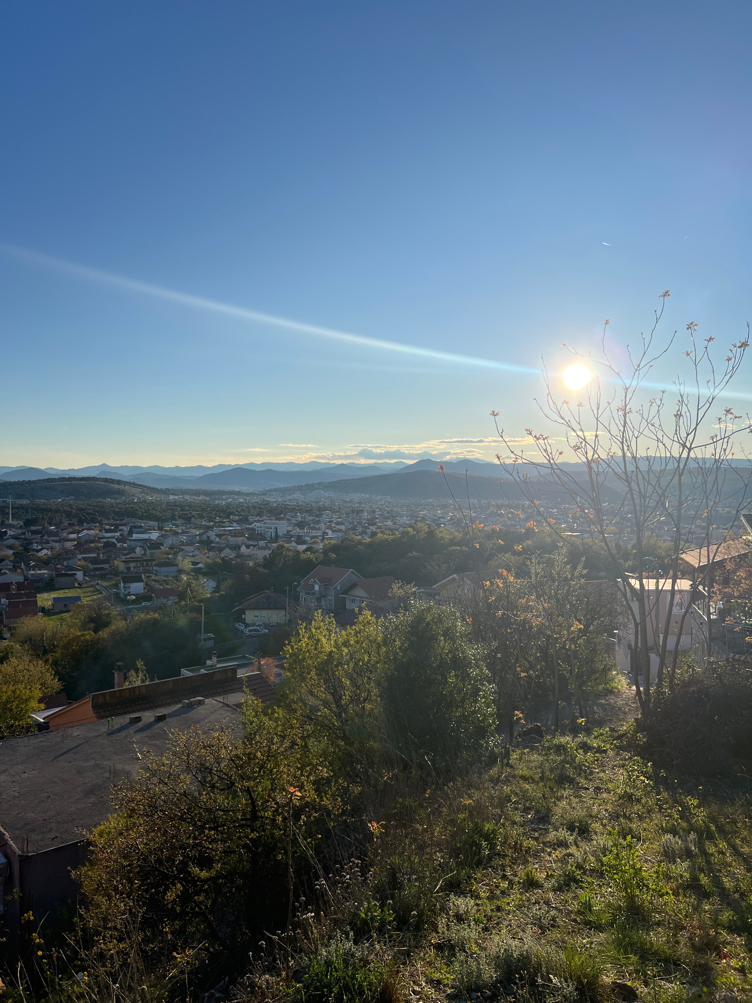 The image shows a cityscape under a bright, sunny sky. A mountain range is visible in the distance, slightly obscured by haze. The sun is prominent in the sky, with a visible sunbeam. In the foregroun…read more