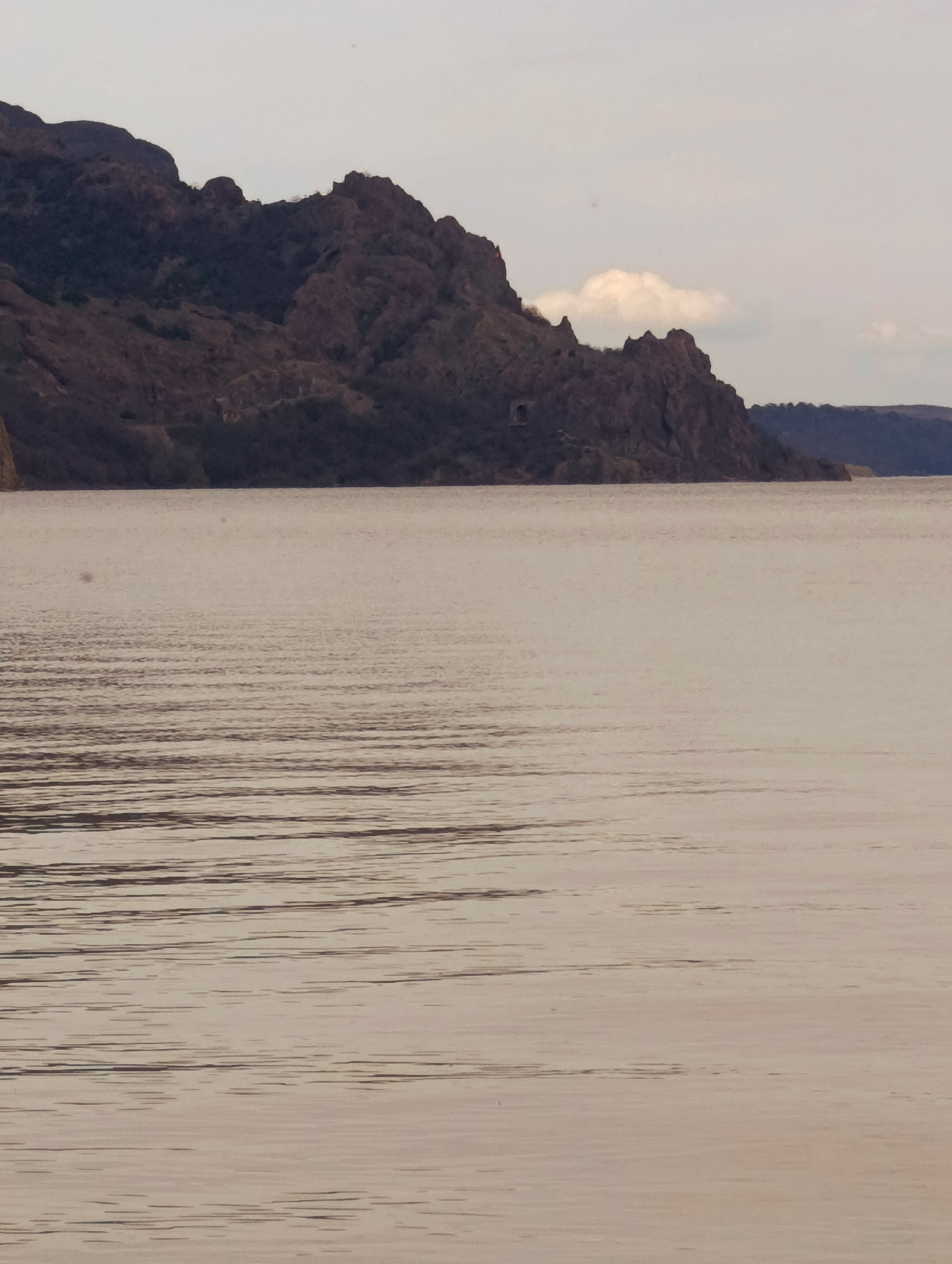 The image depicts a body of water, possibly a lake or sea, with landmasses visible in the distance. The landmasses appear to be rocky and mountainous, with variations in elevation and surface texture.…read more