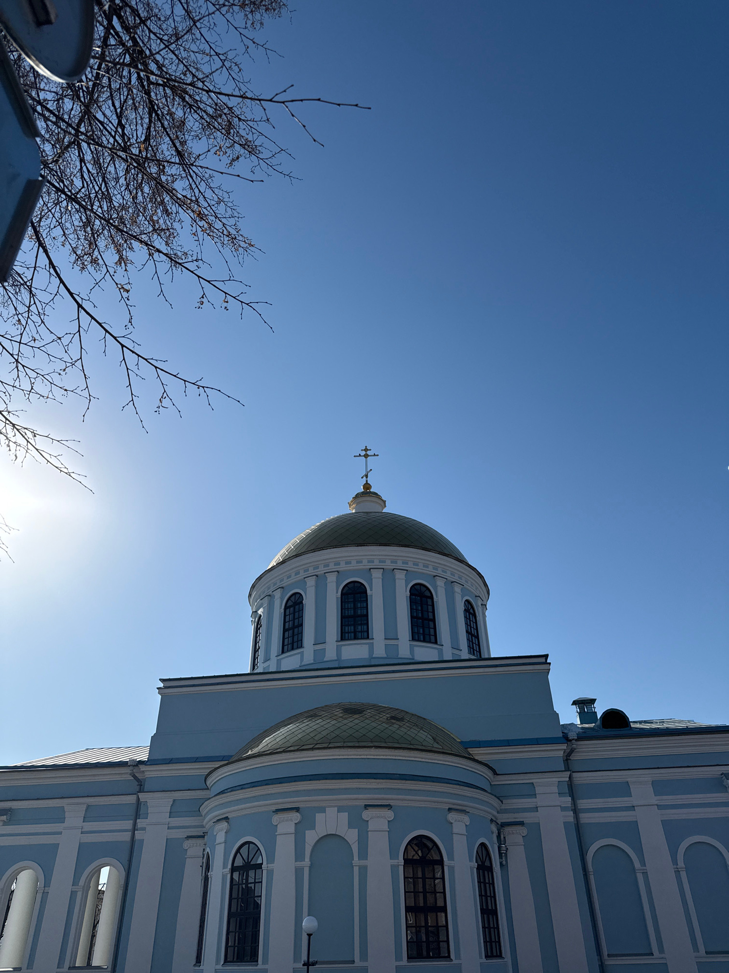 The image shows the exterior of St. Michael's Cathedral in Votkinsk, Russia. The photograph is taken from a low angle, looking upwards at the cathedral's dome and facade against a clear blue sky. Bareβ¦read more