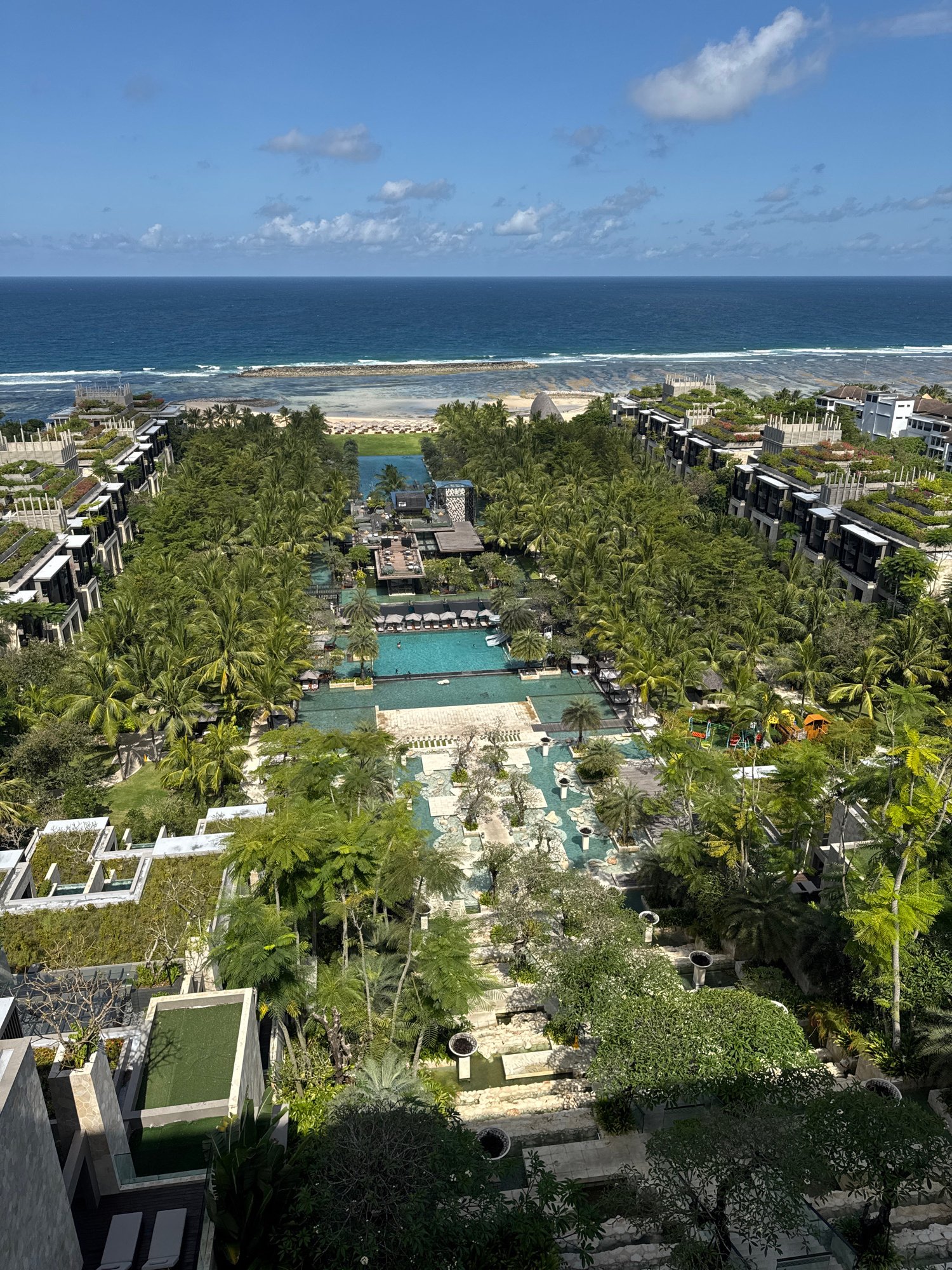 This is an aerial view of a luxury resort along the coastline in Kuta Selatan, Indonesia. The scene captures the beach, the ocean, palm trees, swimming pools, buildings, and some vegetation. On the le…read more