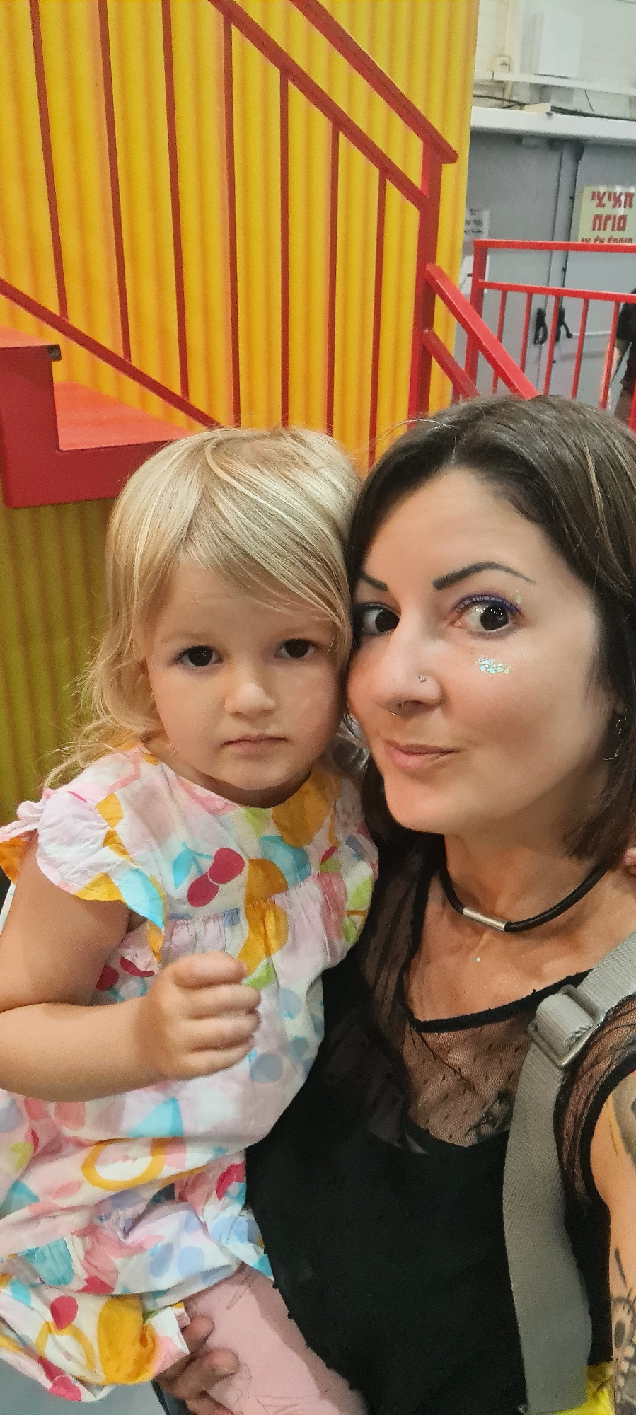 A photograph depicts a woman and a child in close proximity to one another. The woman has dark hair, light skin, and decorative makeup near her eyes. The child has blonde hair and is wearing a pattern…read more