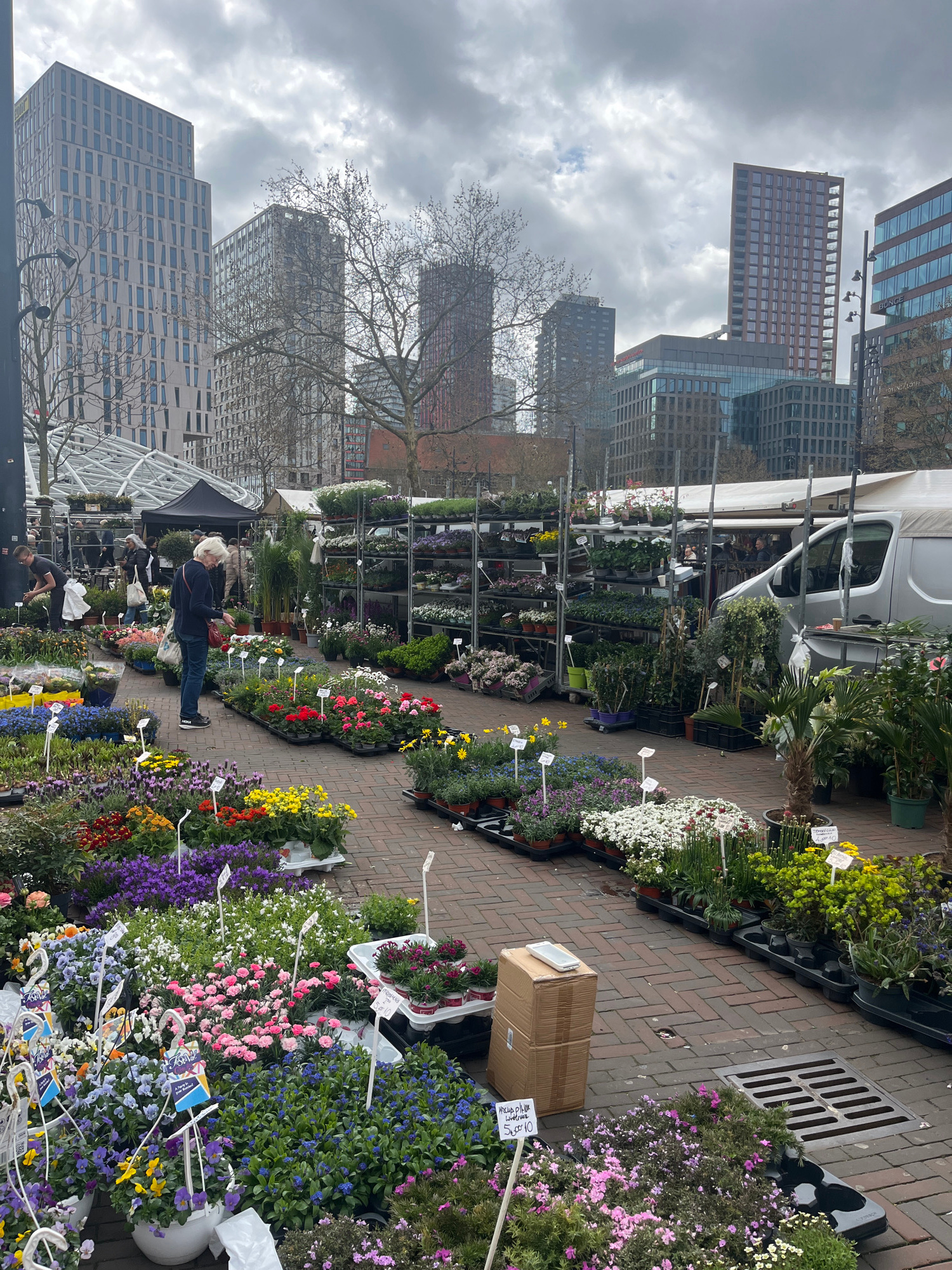 The image captures an outdoor flower market in Rotterdam, Netherlands, set against a backdrop of modern high-rise buildings under a cloudy sky. The flower market is bustling with activity as customers…read more