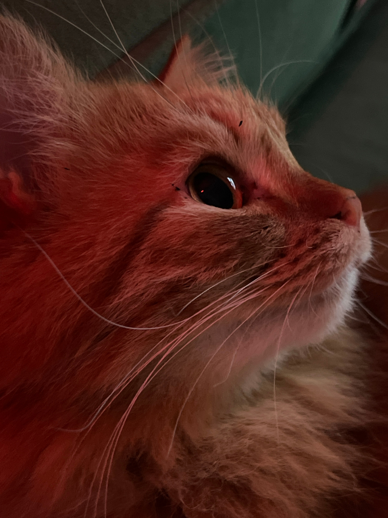 The image shows a close-up of an orange cat's face, specifically its eye, nose, and whiskers. The cat is lying down, with its head tilted back and to the side. There are a few small, dark spots on the…read more