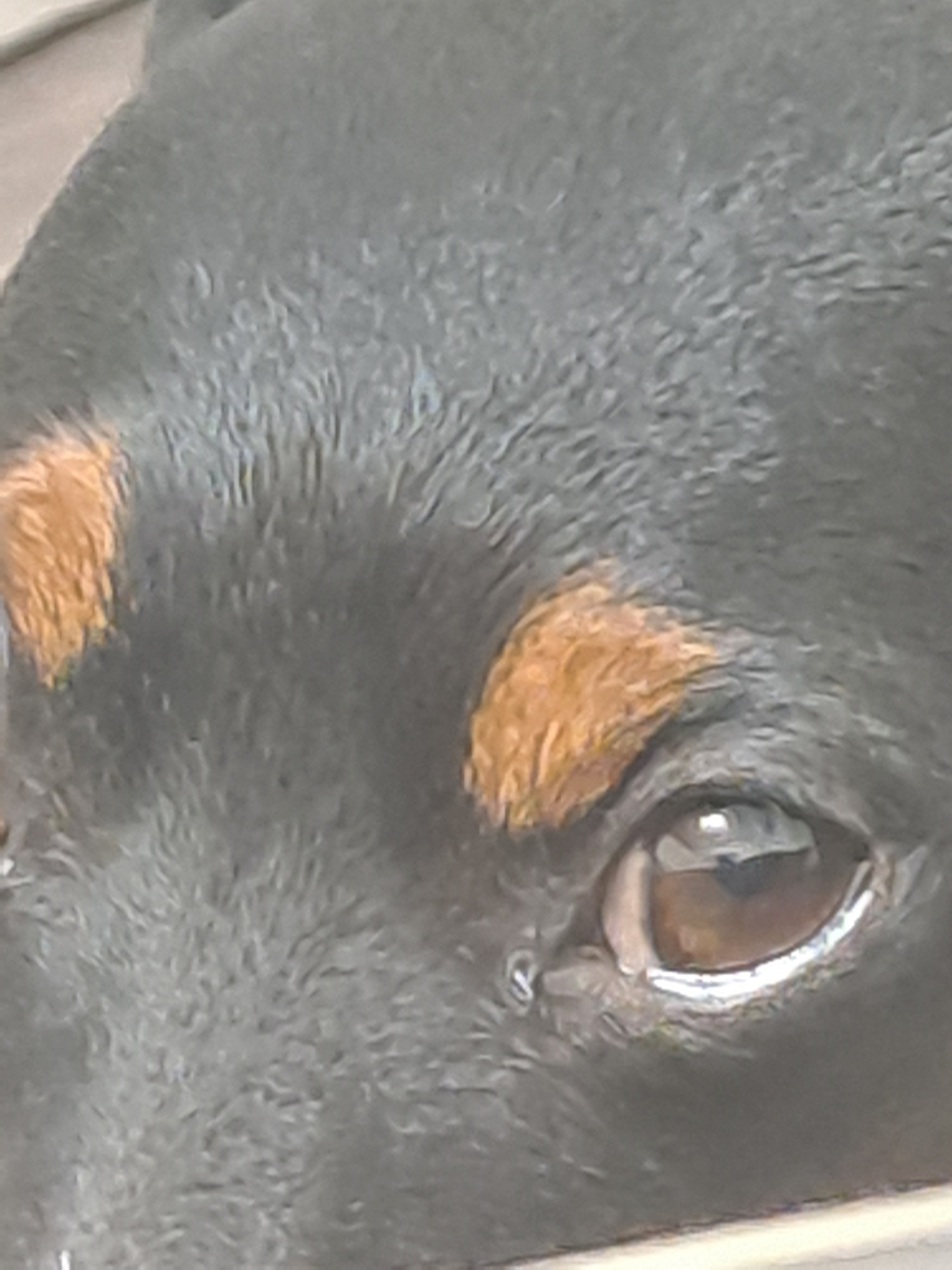 A close-up image focuses on the eye and fur of a black and brown dog. A patch of brown fur is visible near the dog's eye. The dog's eye is brown with a white reflection. Due to the lack of further con…read more