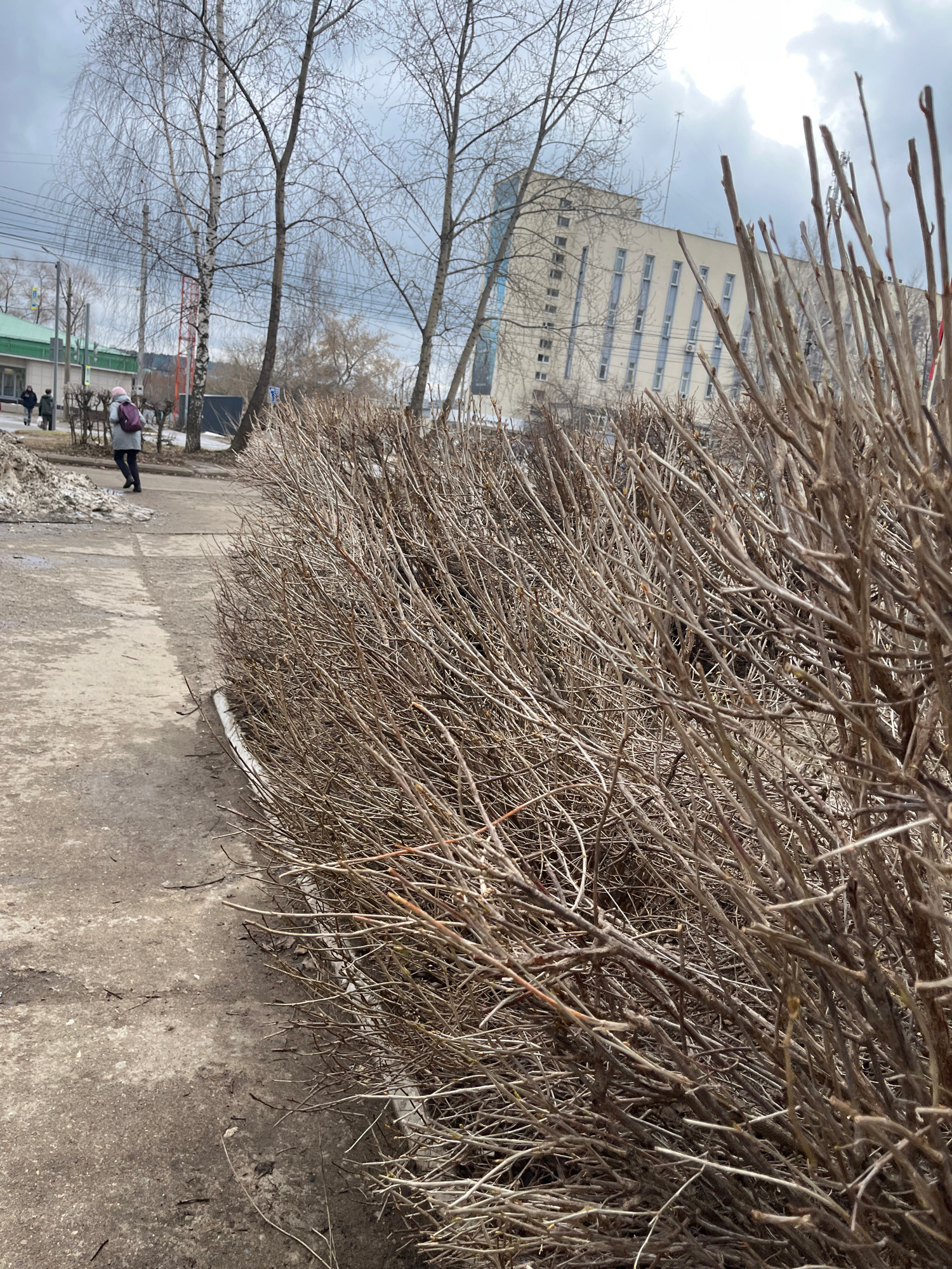 The image shows a sidewalk in the city of Chaikovsky, Russia. A large, dense hedge of leafless branches dominates the foreground, obscuring much of the view. Behind the hedge, a multi-story building i…read more