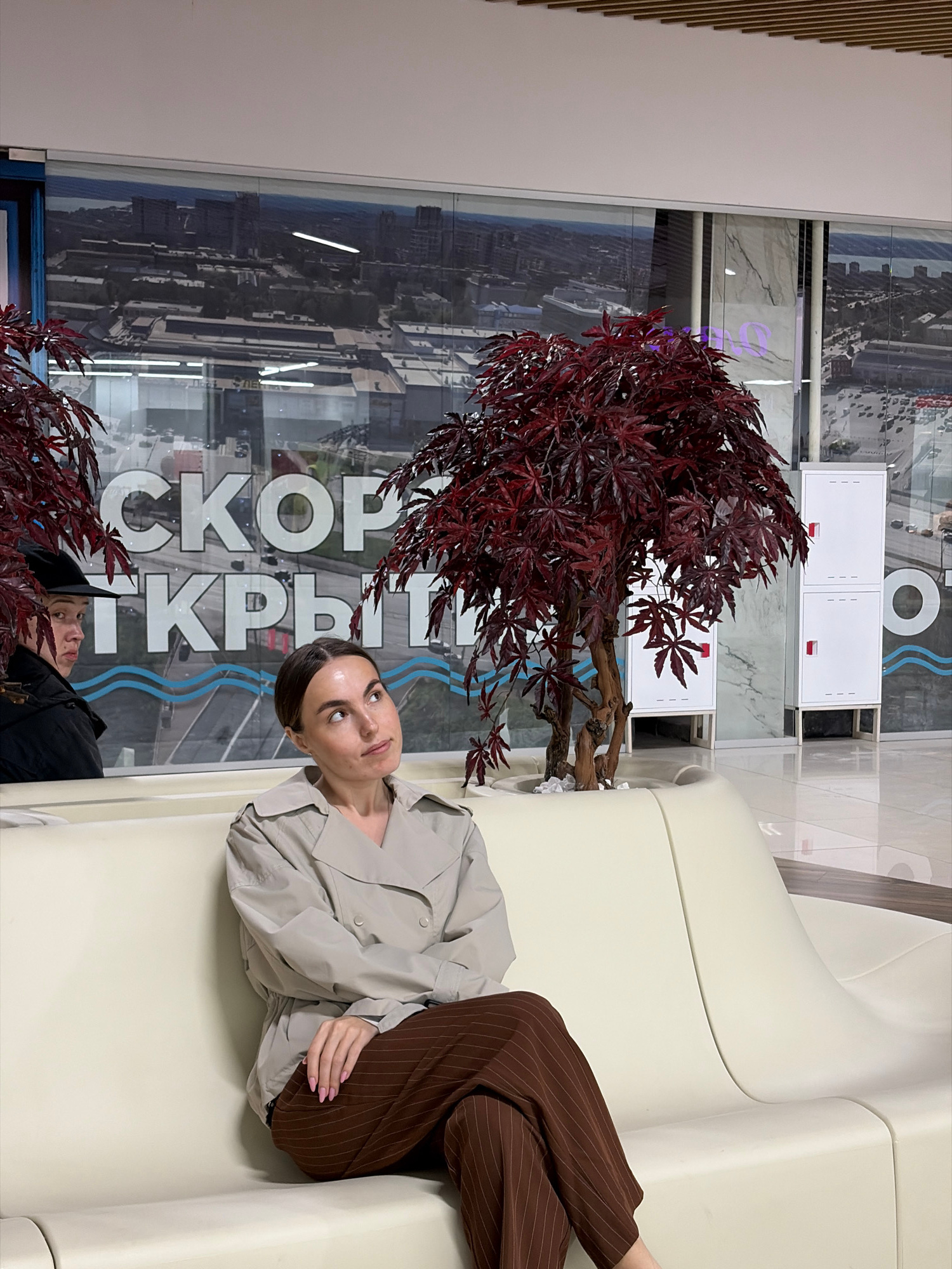 The image depicts an indoor scene, likely a modern waiting area or lobby, brightly lit during the daytime. The primary subject is a woman reclining on a plush, light-colored sofa situated on the right…read more