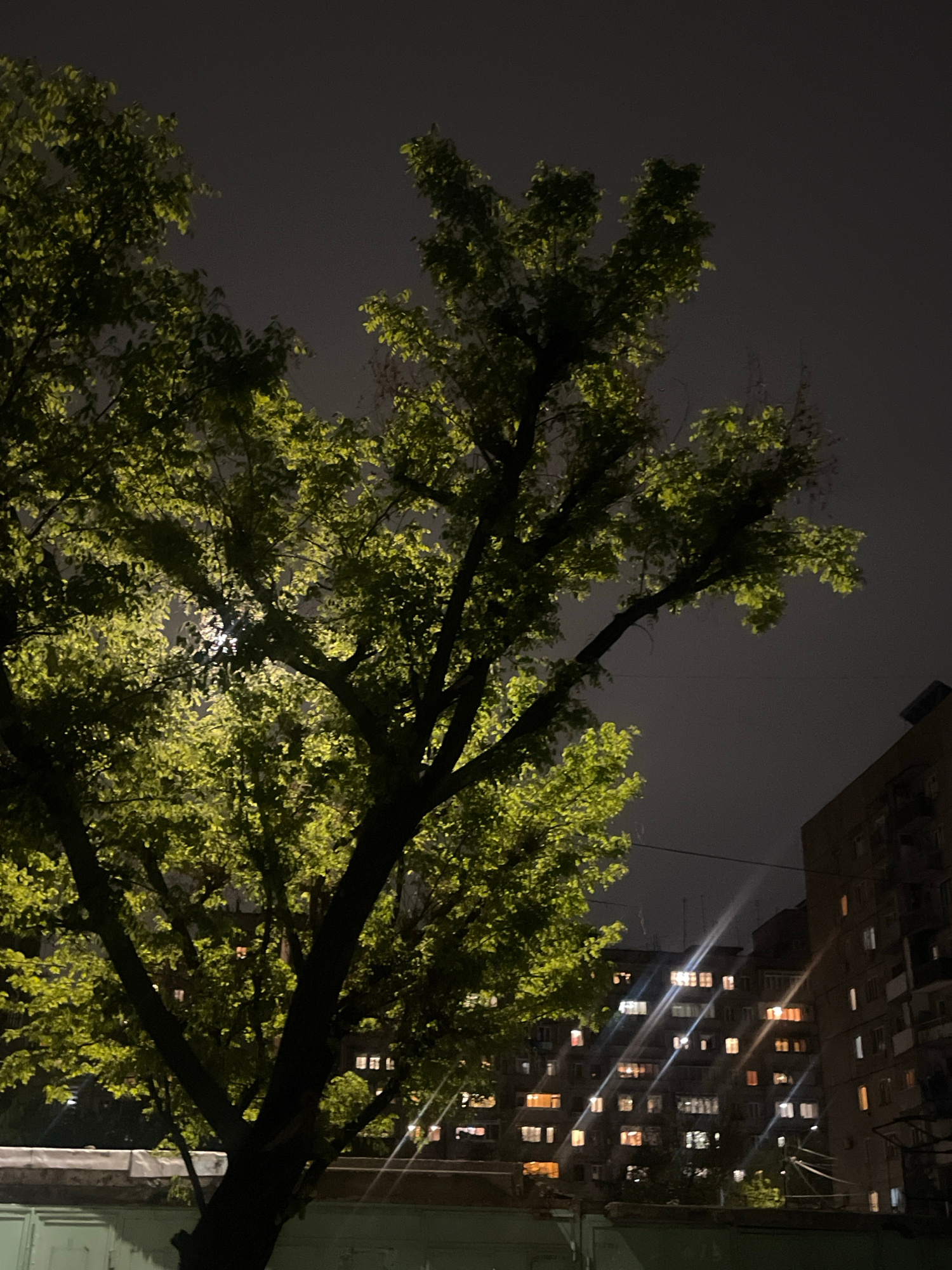 The image captures a night scene in what appears to be an urban environment. A tree with illuminated green leaves dominates the foreground, likely lit by artificial light, as a dark sky fills the back…read more