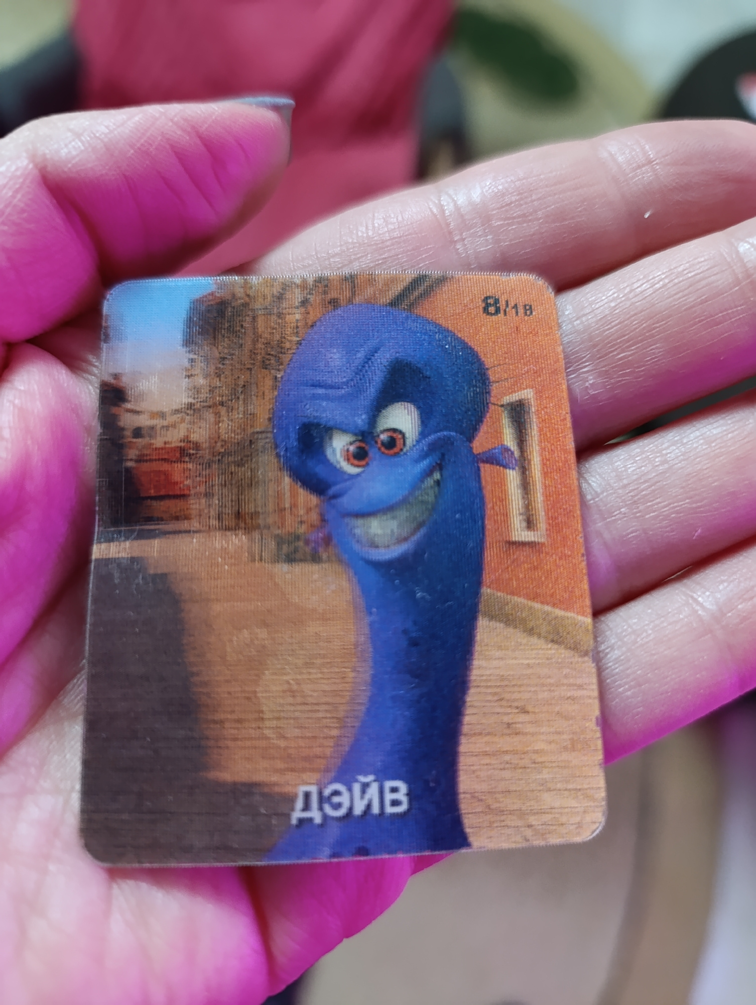 A square, laminated card featuring an animated blue character named “Дэйв” (Dave) is held in a person's hand. The card also shows the number “8/18”. The card's backdrop includes a city street with bui…read more
