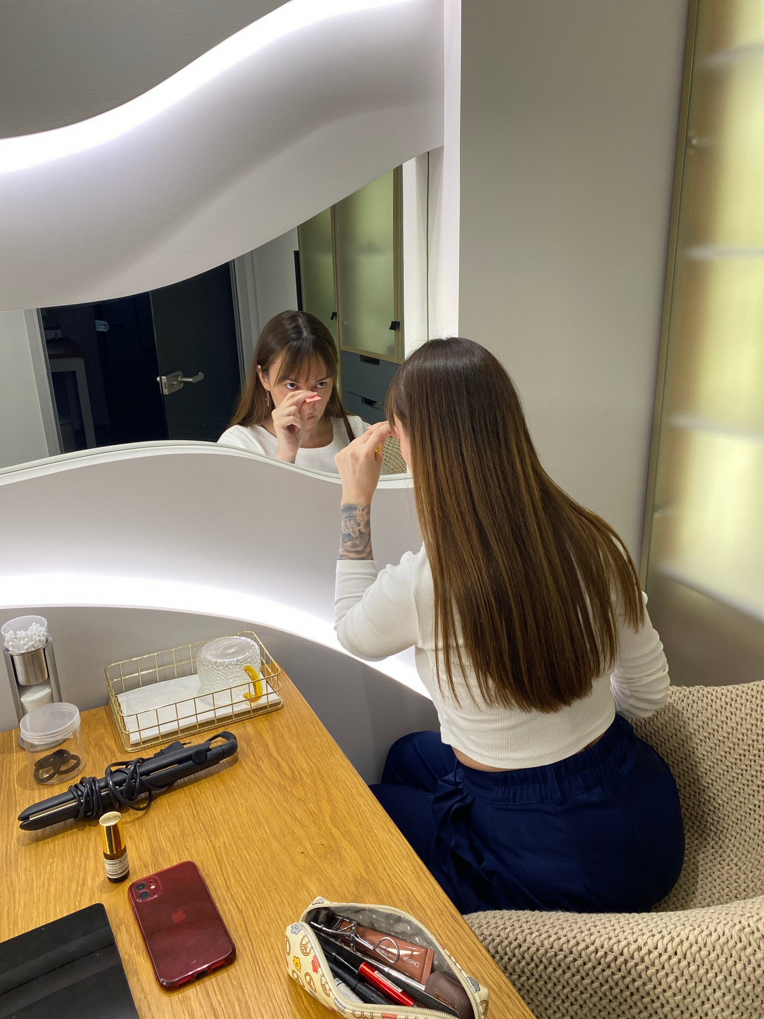 A woman with long brown hair, wearing a white top and blue pants, sits in front of a vanity mirror. Her reflection shows her smiling and holding something up to her face. The vanity has a wooden count…read more