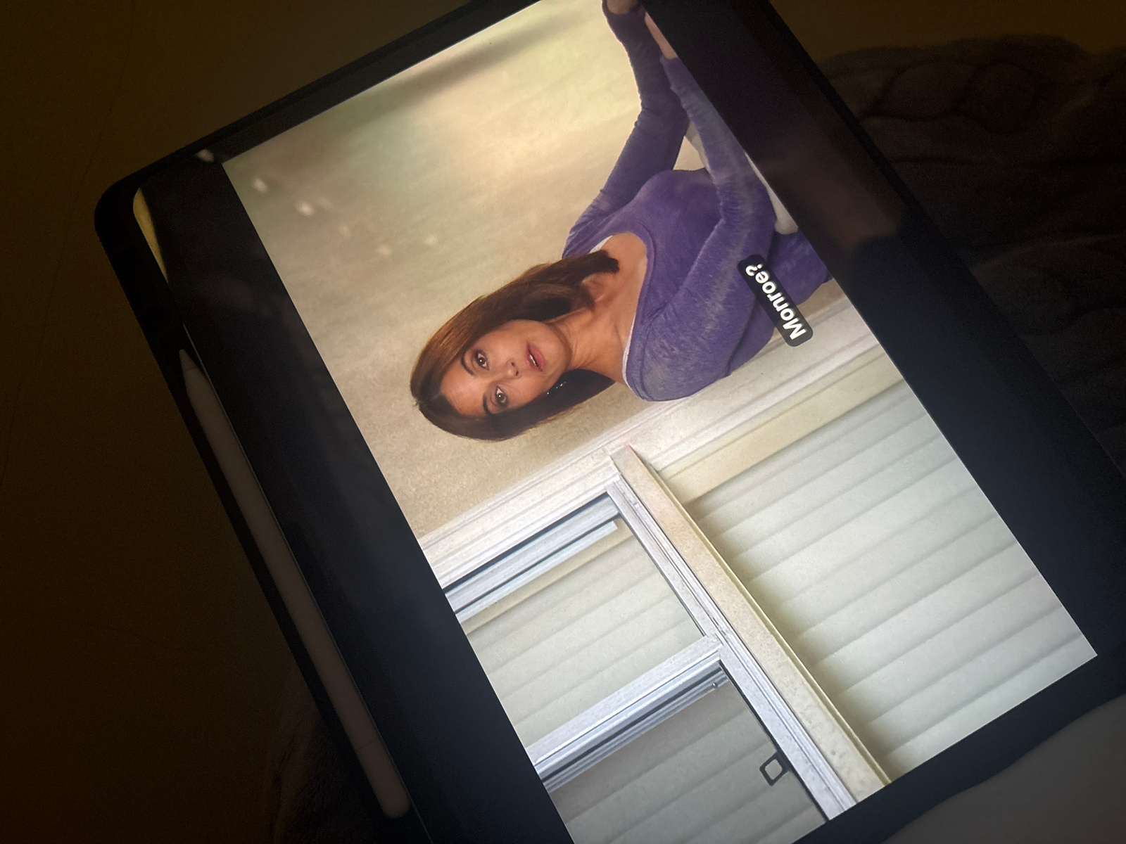 A woman in purple athletic wear is lying on the floor in an Unknown location, as viewed on a tablet. The background includes blinds, and a text overlay says "Monroe?". A stylus is beside the tablet.