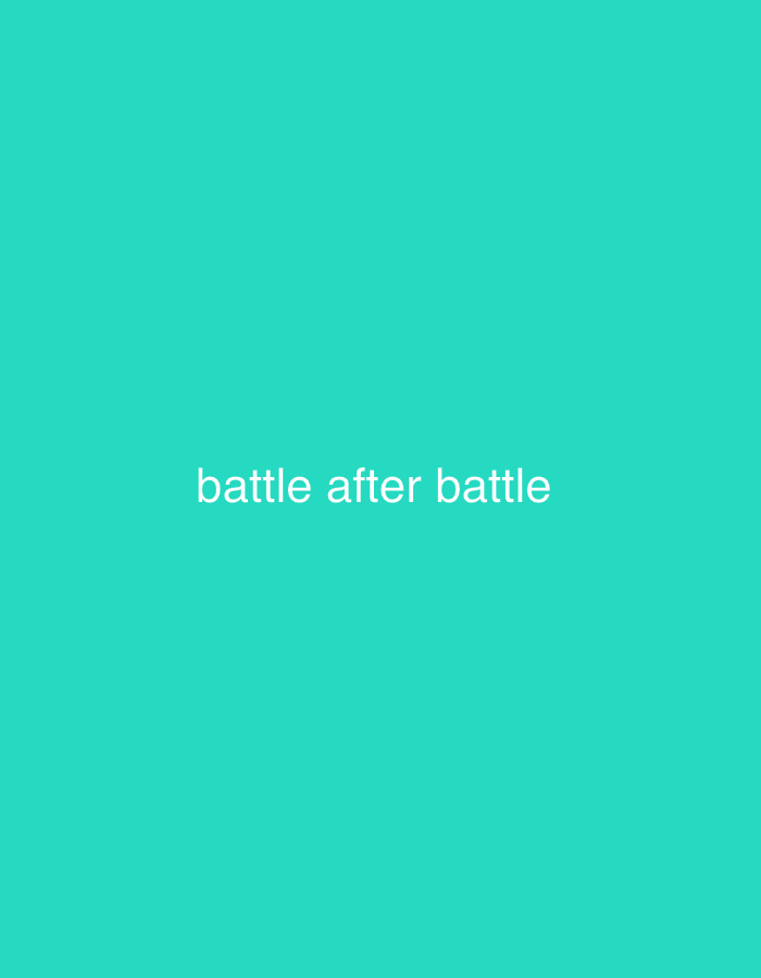 The image presents a bright teal background with the phrase "battle after battle" centered horizontally and vertically. The text is white and in a simple, sans-serif font. The overall composition is m…read more