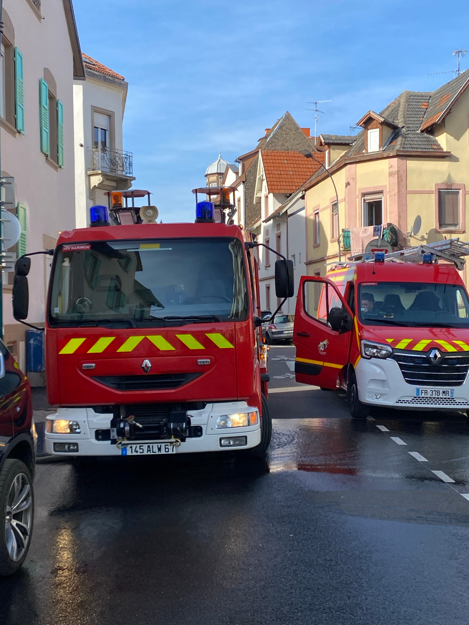 The image shows two red and white fire trucks parked on a wet street in Bischheim, France. The foreground fire truck has its driver-side door open. The license plate of the foreground truck reads "145…read more