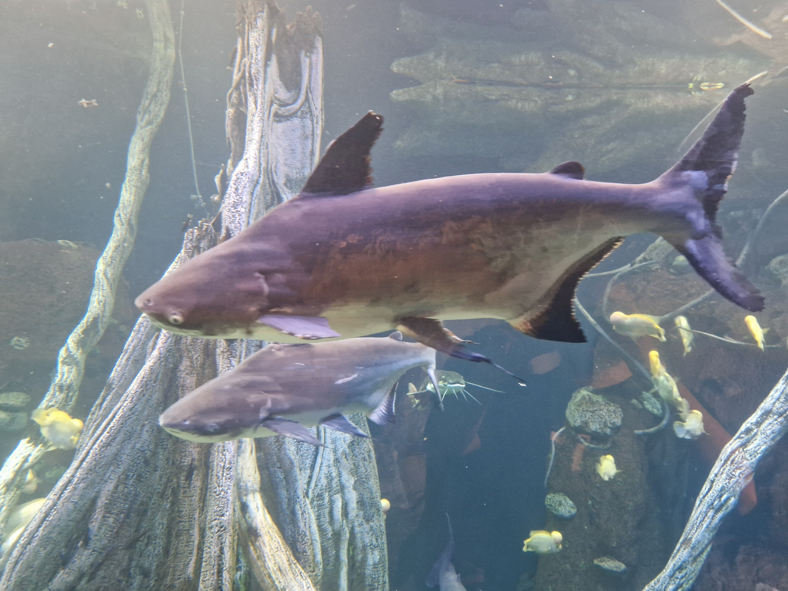 The image depicts two Iridescent Sharks swimming in an aquarium. The larger shark is positioned at the top of the frame, with a smaller shark beneath it. Several smaller, yellow fish are scattered aro…read more