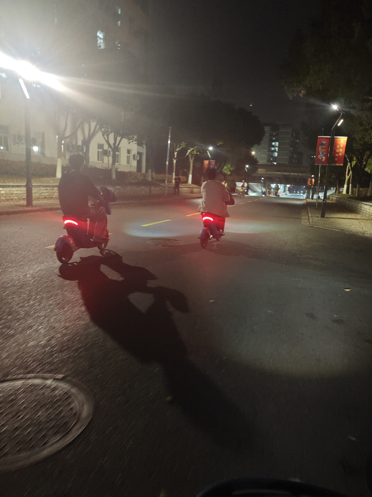 Two people are riding electric scooters on a road at night in Jiangning District, China. The road is paved and lit by streetlights. One person is wearing dark clothing, and the other is wearing lightβ¦read more