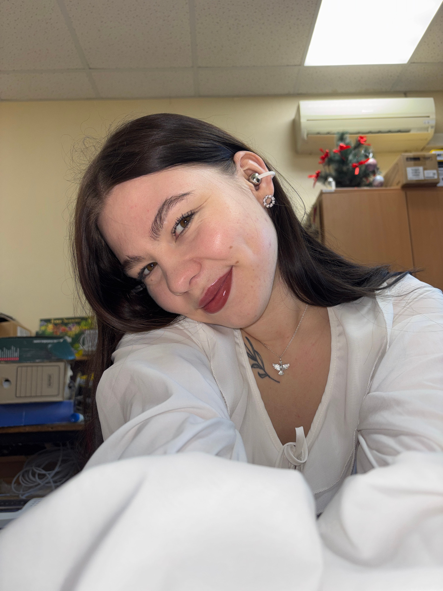 A photograph captures a woman indoors, likely in an office environment. She is wearing a white blouse, a silver necklace with a small pendant, and earrings. She has dark hair, fair skin, and is wearin…read more