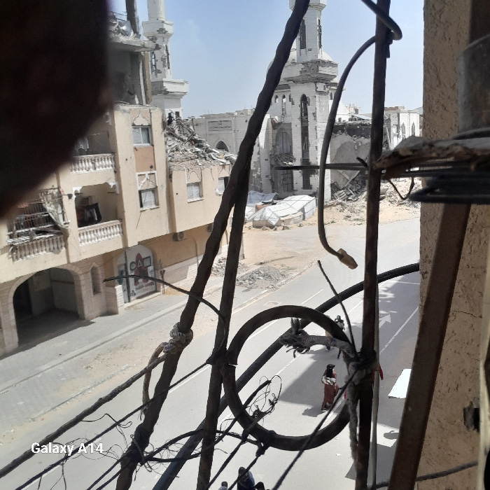 The image depicts a scene of extensive urban destruction in Khan Yunis, Palestinian Territory, viewed from an elevated perspective. In the immediate foreground, a dense network of dark, weathered wire…read more