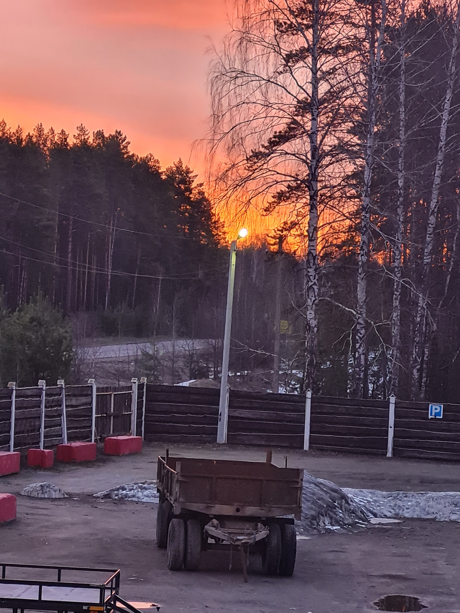 The image captures a sunset scene in Noviy, Russia. The sun is visible through the trees, casting an orange glow across the sky. A truck with a trailer is parked on a paved surface next to a fence and…read more
