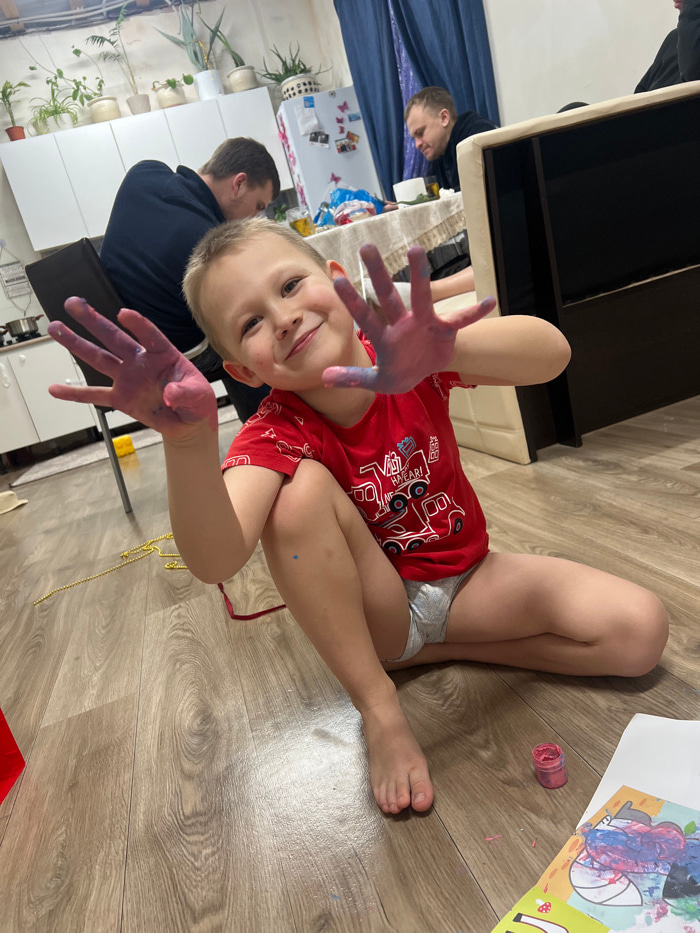A young boy with paint-covered hands lies on a wooden floor, smiling at the camera. He wears a red shirt and light-colored underwear. An open jar of paint sits nearby. A drawing, also with paint, is o…read more