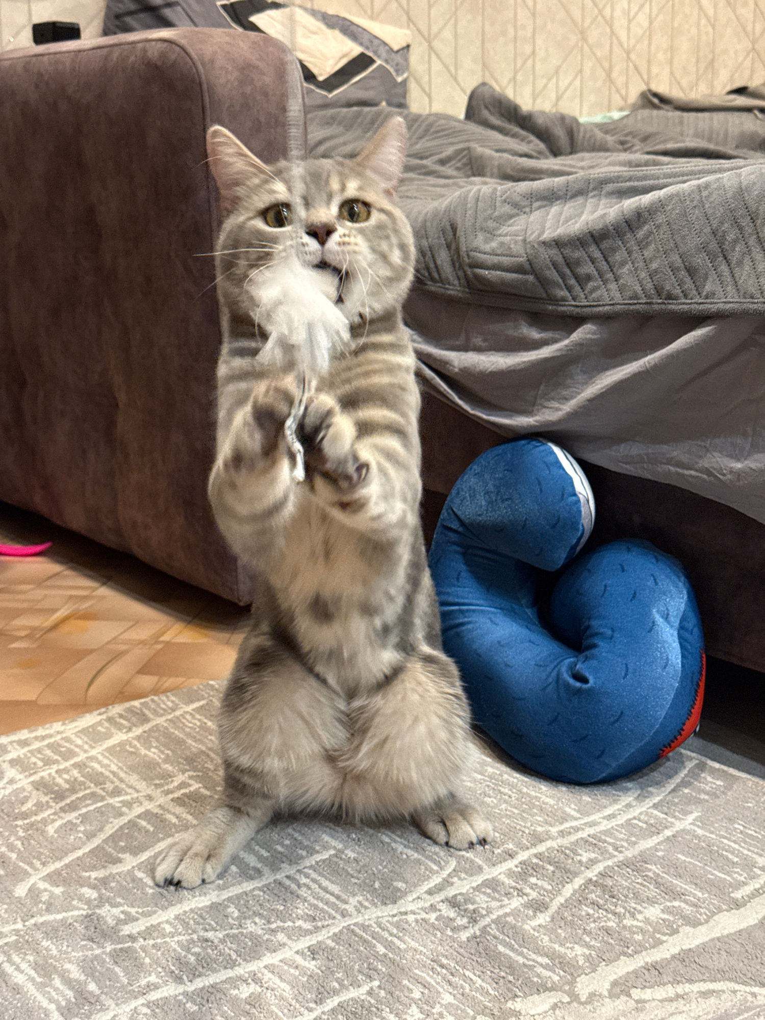 A gray tabby cat is lying on its back on a brown couch with gray blankets. The cat is holding a white fluffy object in its paws, looking at the camera. Next to the cat is a blue horseshoe-shaped pillo…read more