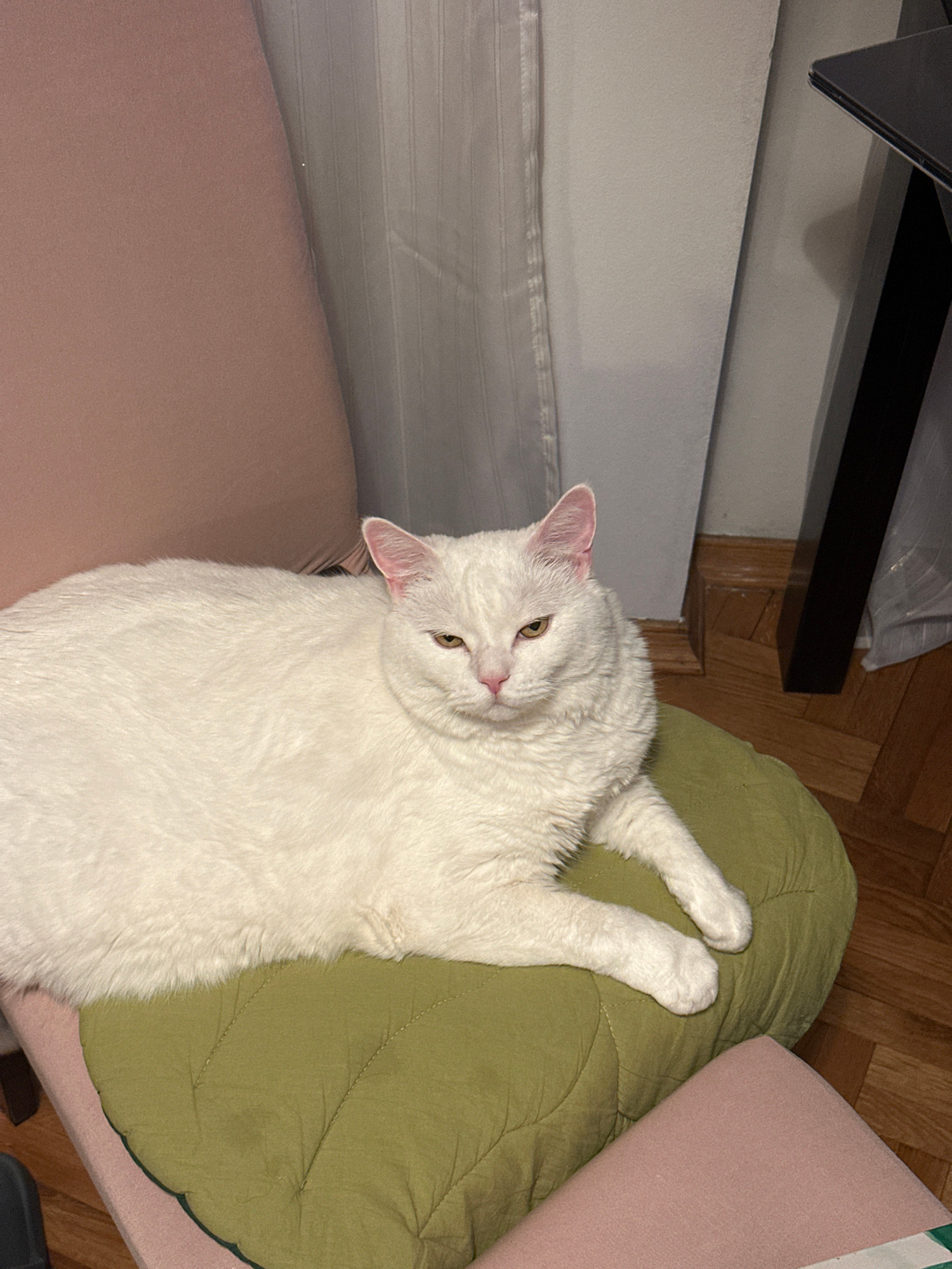 A white cat with short fur is lying on a green leaf-shaped cushion. The cushion sits on a pink upholstered surface, likely a chair or sofa. The cat is positioned at an angle, with its head closer to t…read more