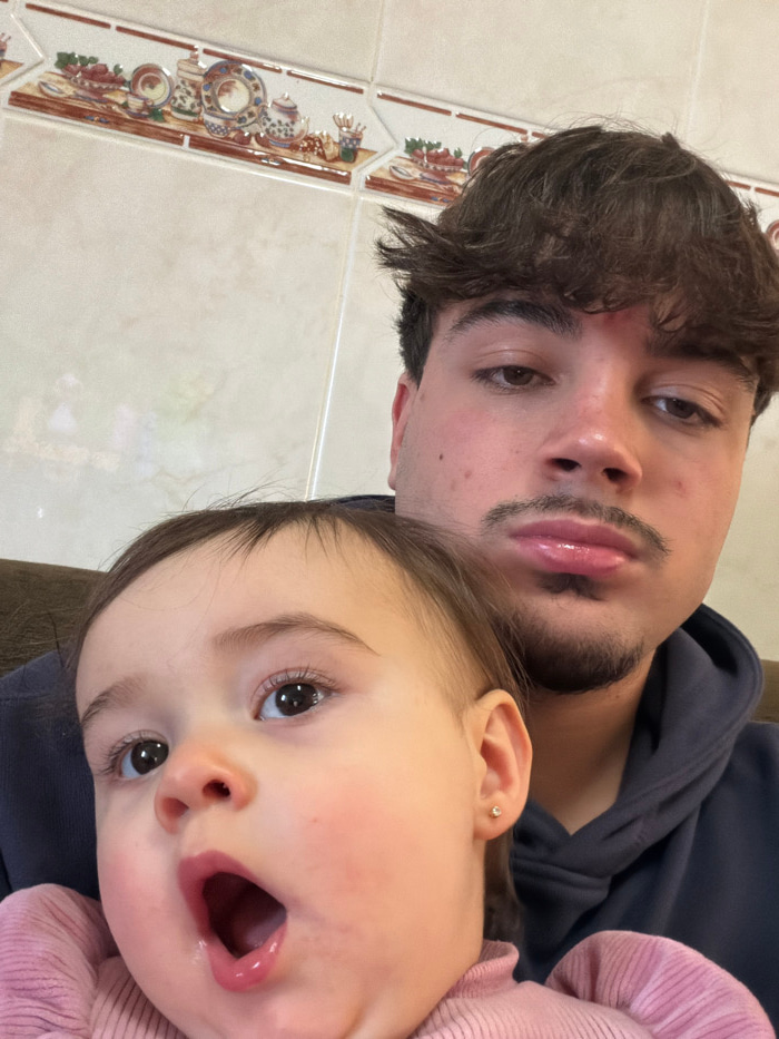 An indoor scene features two individuals positioned for a close-up, selfie-style photograph. An adult male with dark brown, disheveled hair, light brown eyes, and a faint mustache and chin beard occup…read more