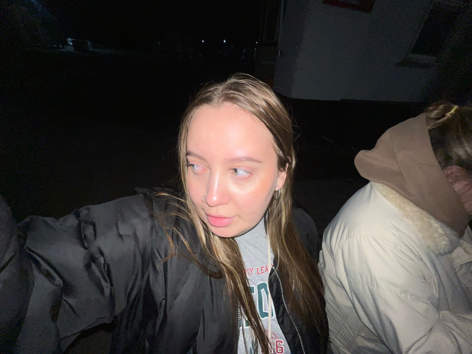 The image shows a person with light skin and light brown hair wearing a gray shirt with a graphic design, a black jacket, and a nose ring. They are in an upside-down orientation. The background shows…read more
