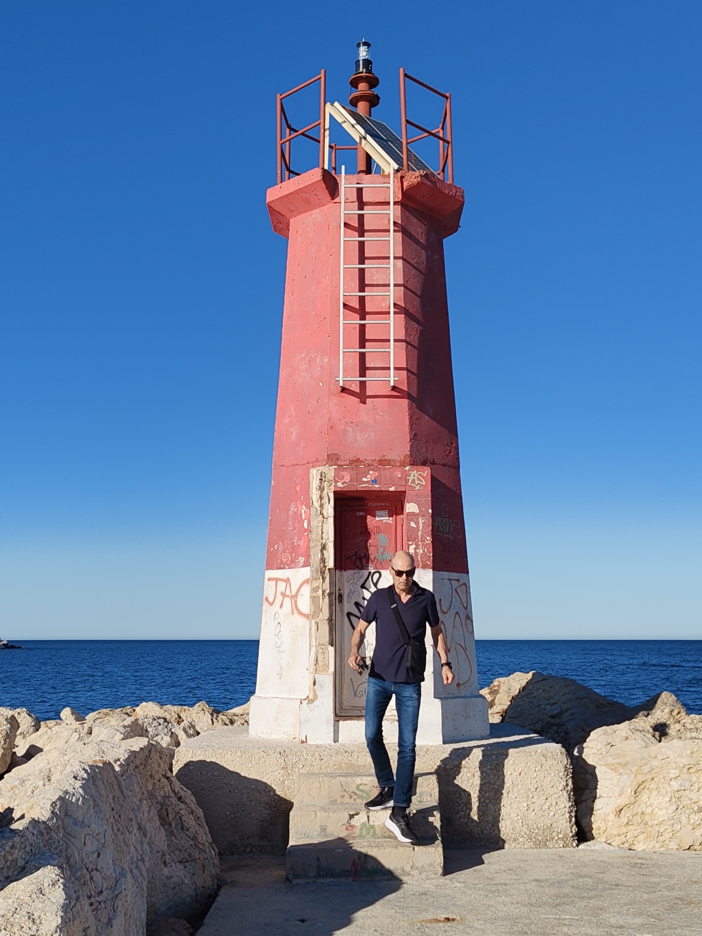 A full-length outdoor shot captures a vibrant red and white lighthouse on a sunny day in Dénia, Spain. The small beacon tower is situated on a concrete and rocky breakwater, with the deep blue sea str…read more