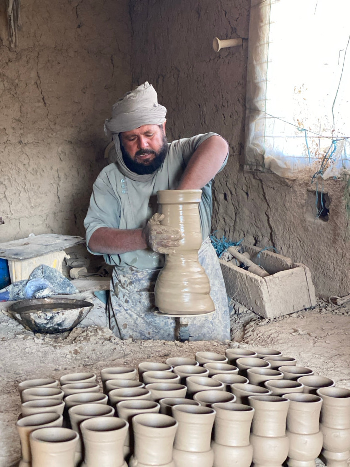 An adult male artisan is depicted within a rustic, mud-walled pottery workshop in Kandahar, Afghanistan. He wears a light-colored turban, a light-blue tunic, and a stained apron, and has a dark beard.…read more