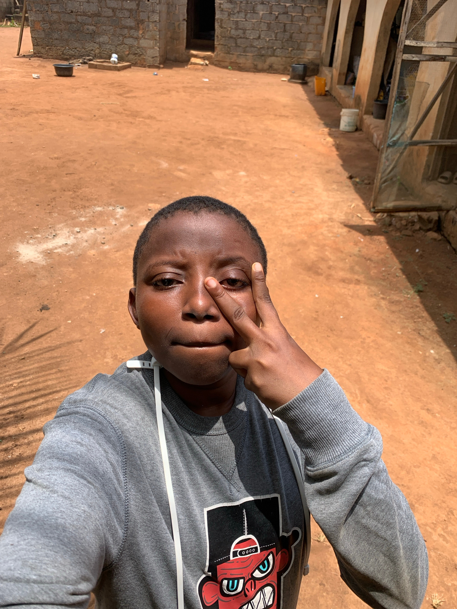 The image shows a person with dark skin, wearing a gray sweatshirt with a cartoon graphic, holding two fingers to their face. The background shows a reddish-brown dirt ground, and a building constructβ¦read more