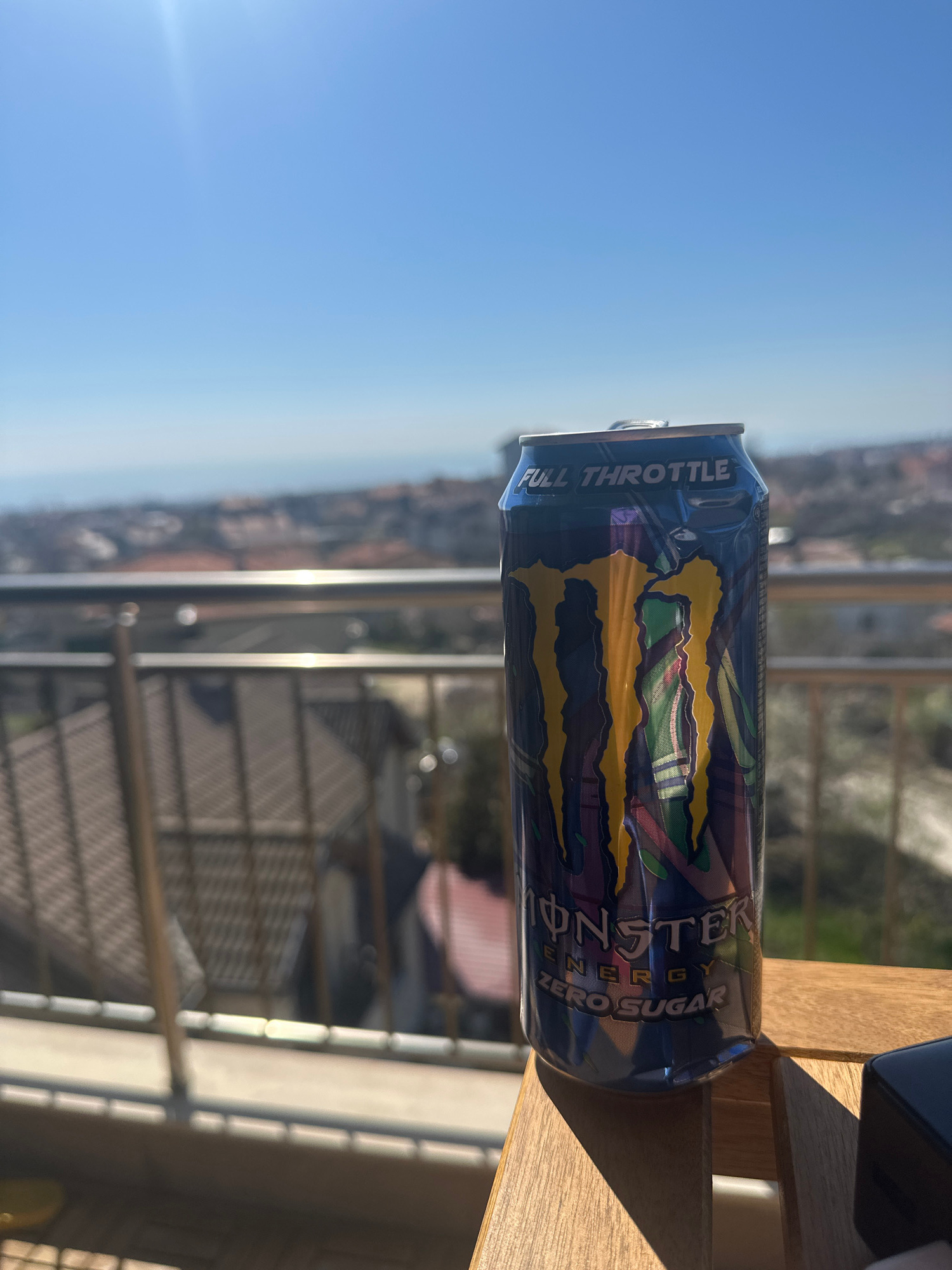 A tilted, close-up shot of a can of "Monster Energy Zero Sugar - Full Throttle" drink placed on a wooden surface. The background shows a cityscape with railings, suggesting a balcony or elevated posit…read more