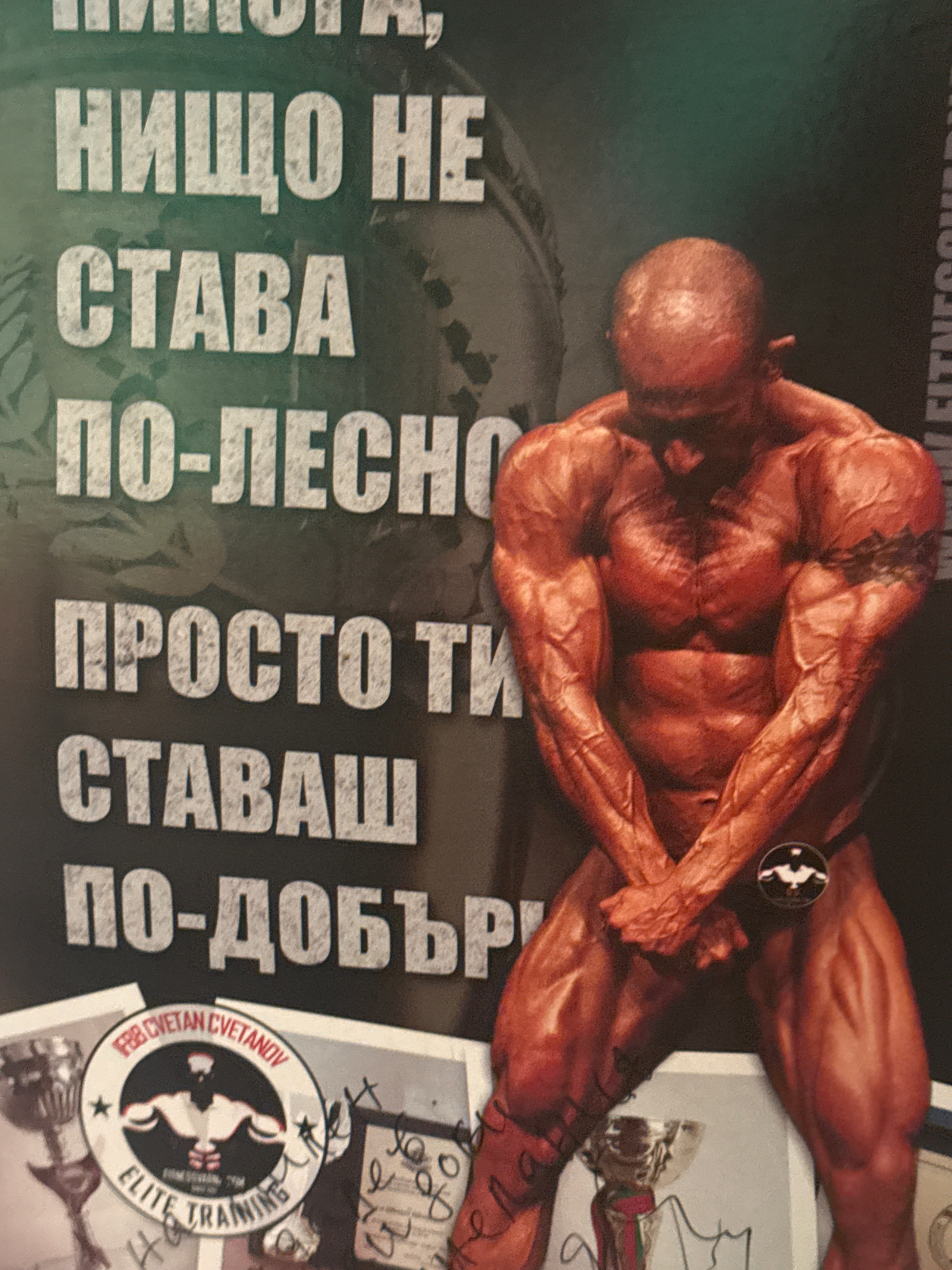 The image displays a highly muscular, bald bodybuilder, heavily spray-tanned, striking a pose that emphasizes his back and arm musculature. He is positioned against a dark, faded green and black backg…read more