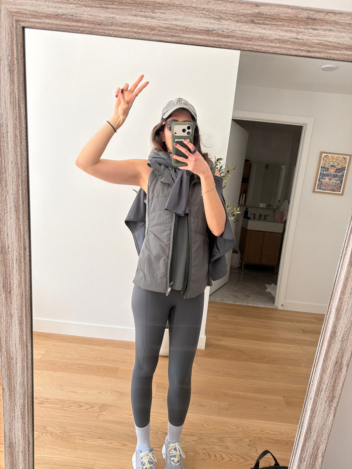 An indoor mirror selfie captures a female individual positioned centrally within the frame, in an apartment or residential setting in New York, United States of America. She wears a grey baseball cap,…read more