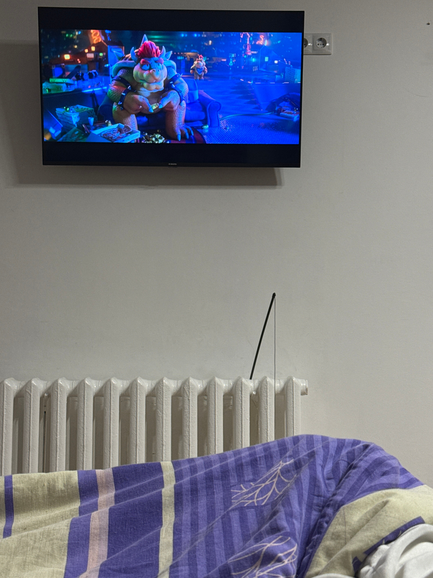 A television screen displays a cartoon of a monster on the wall. Next to the TV, a white radiator is partially covered by a folded purple-striped cloth. A black antenna is pointed towards the center o…read more
