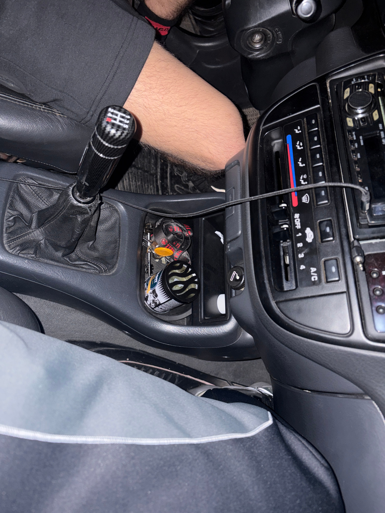 The image shows the interior of a car. The dashboard has a radio, climate controls, and a cigarette lighter. Below the dashboard is a compartment containing keys and an air freshener. A six-speed manu…read more