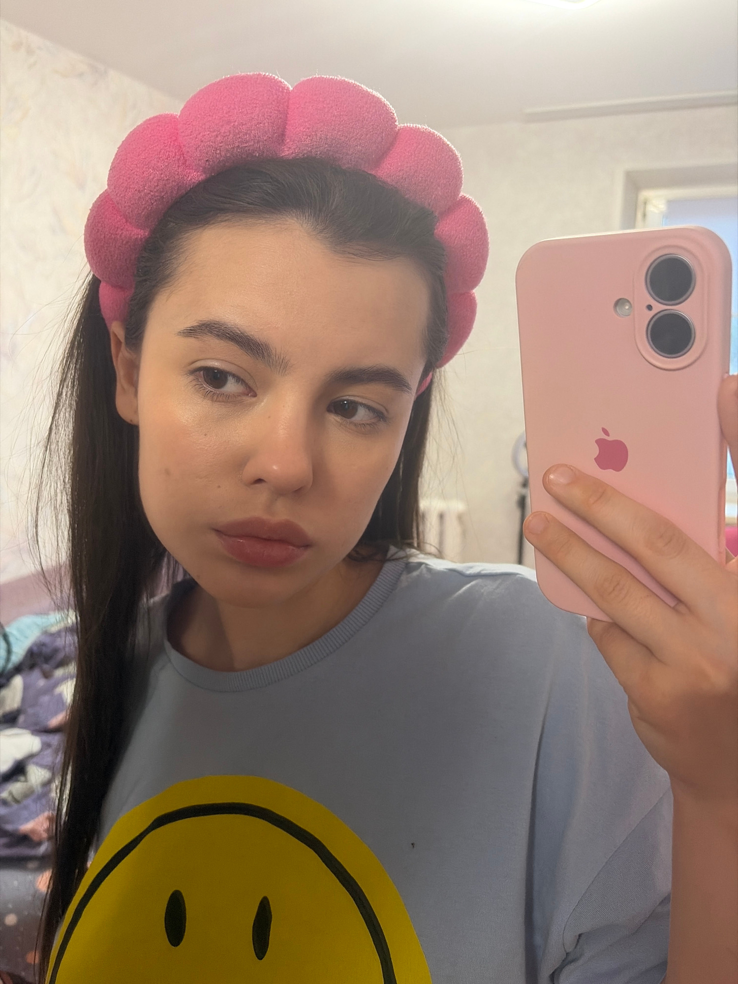 A young woman is taking a selfie in what appears to be an indoor setting. She holds a pink iPhone, its Apple logo visible. She wears a light blue t-shirt with a large, yellow smiley face graphic on th…read more